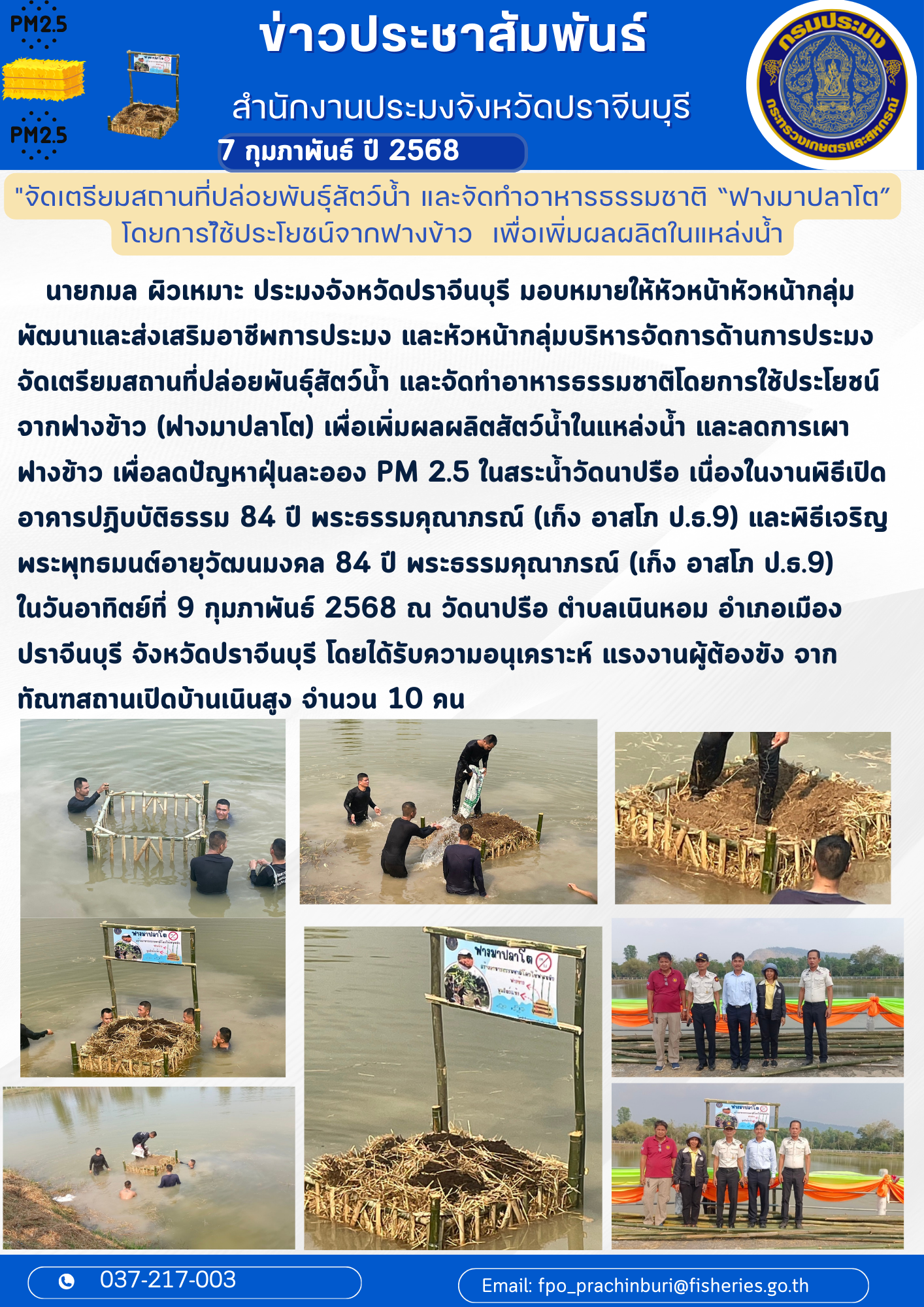 ข่าวประชาสัมพันธ์ "จัดเตรียมสถานที่ปล่อยพันธุ์สัตว์น้ำ และจัดทําอาหารธรรมชาติ "ฟางมาปลาโต" โดยการใช้ประโยชน์จากฟางข้าว เพื่อเพิ่มผลผลิตในแหล่งน้ำ