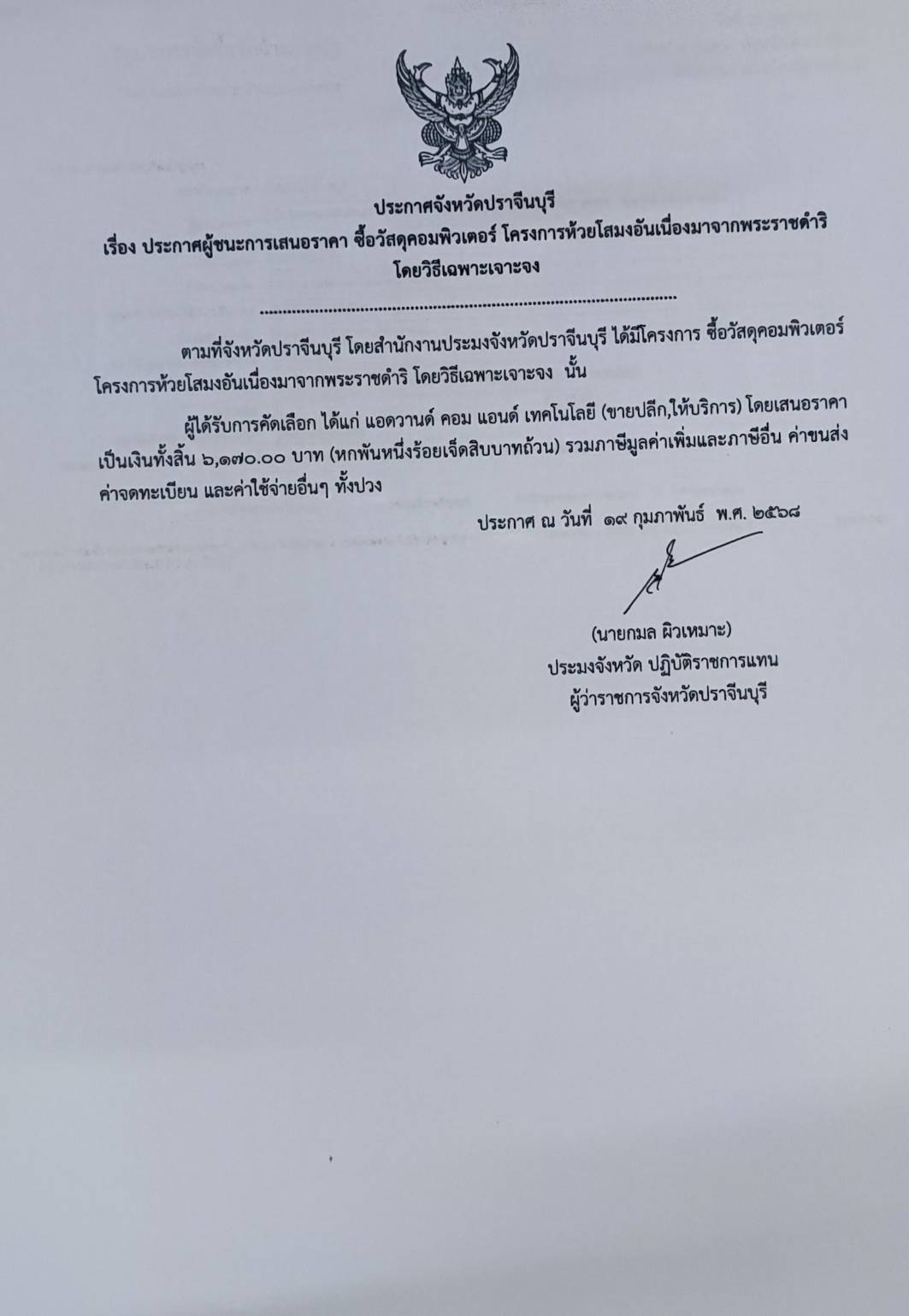 ประกาศผู้ชนะการเสนอราคา จัดซื้อวัสดุคอมพิวเตอร์ โครงการห้วยโสมงอันเนื่องมาจากพระราชดำริโดยวิธีเฉพาะเจาะจง