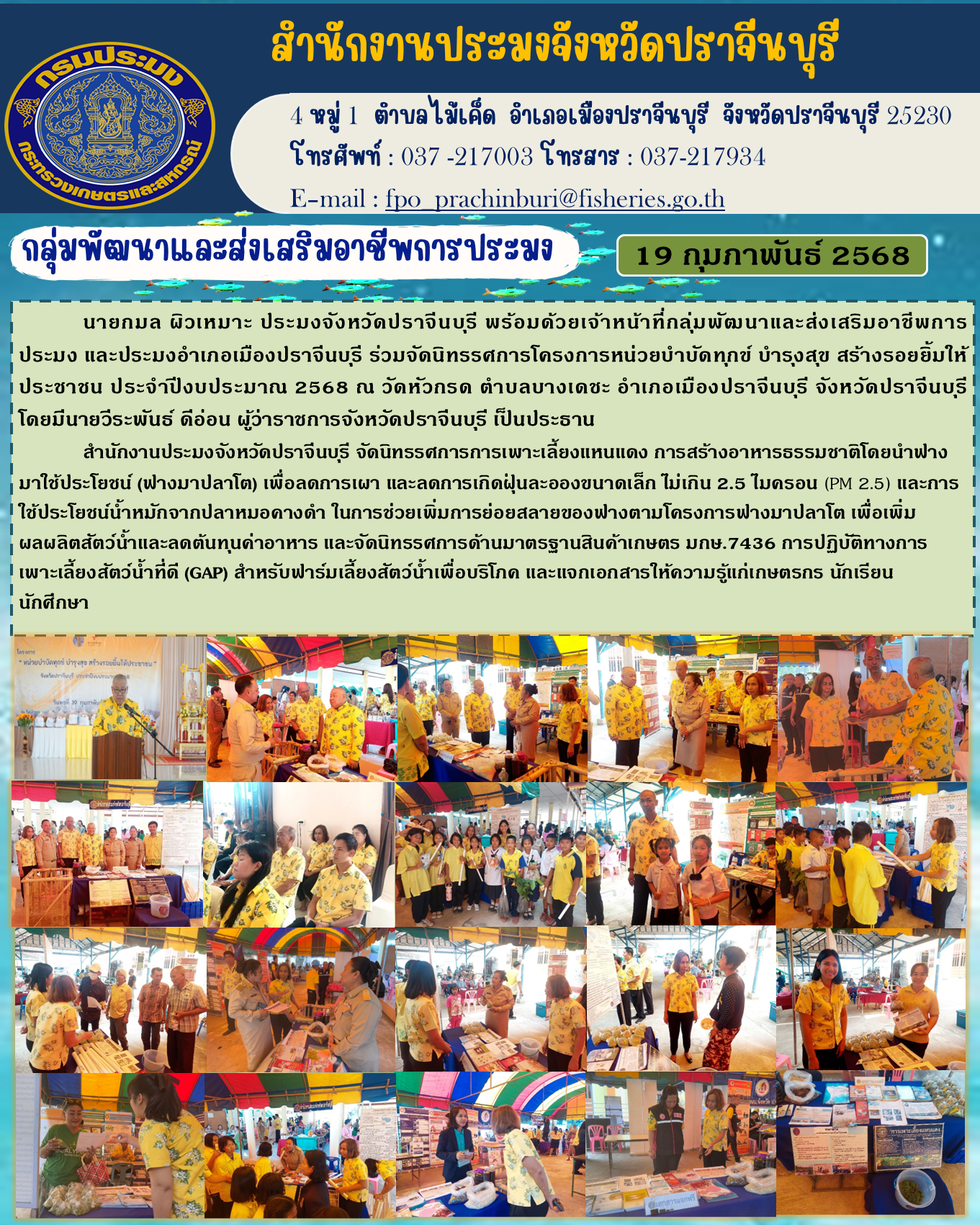 ข่าวประชาสัมพันธ์ กลุ่มพัฒนาและส่งเสริมอาชีพการประมง ร่วมจัดนิทรรศการโครงการหน่วยบำบัดทุกข์ บำรุงสุข สร้างรอยยิ้มให้ ประชาชน ประจําปีงบประมาณ 2568