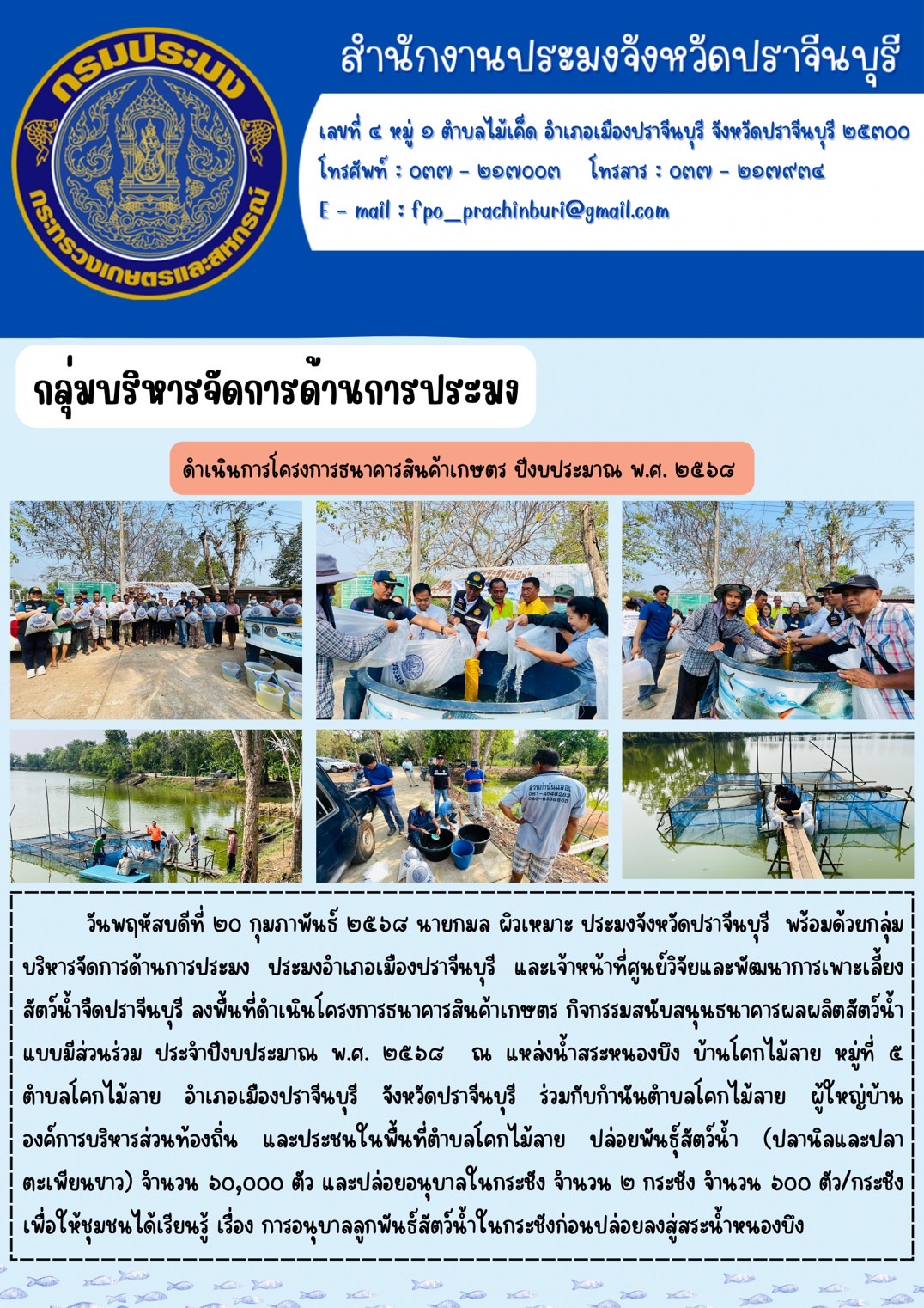 ข่าวประชาสัมพันธ์ กลุ่มบริหารจัดการด้านการประมง ลงพื้นที่ดำเนินโครงการธนาคารสินค้าเกษตร กิจกรรมสนับสนุนธนาคารผลผลิตสัตว์น้ำ แบบมีส่วนร่วม ประจำปีงบประมาณ พ.ศ. ๒๕๖๘