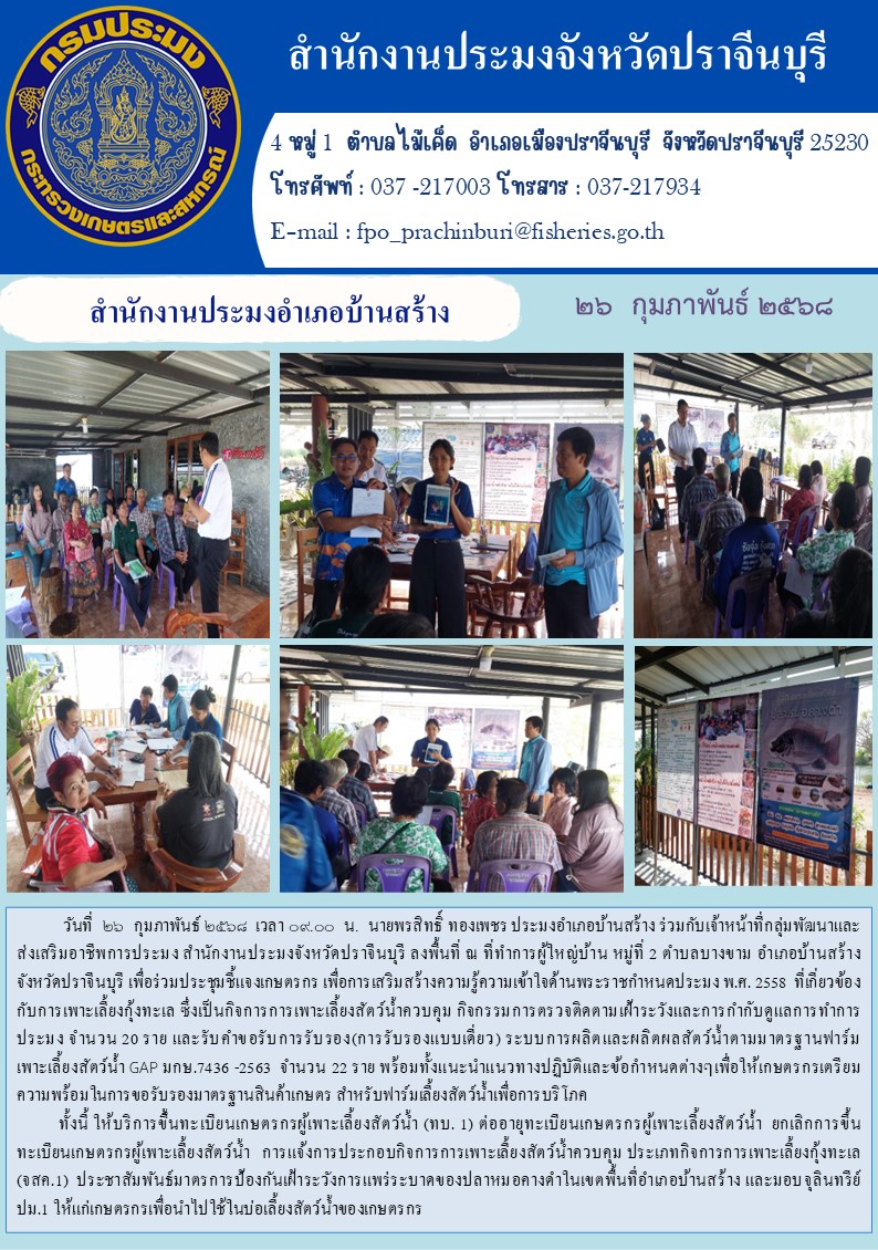 ข่าวประชาสัมพันธ์ สำนักงานประมงอำเภอบ้านสร้าง ประชุมชี้แจงเกษตรกร เพื่อการเสริมสร้างความรู้ความเข้าใจด้านพระราชกำหนดประมง พ.ศ. 2558 ที่เกี่ยวข้อง กับการเพาะเลี้ยงกุ้งทะเล ซึ่งเป็นกิจการการเพาะเลี้ยงสัตว์น้ำควบคุม กิจกรรมการตรวจติดตามเฝ้าระวังและการกำกับดูแลการทำการ
