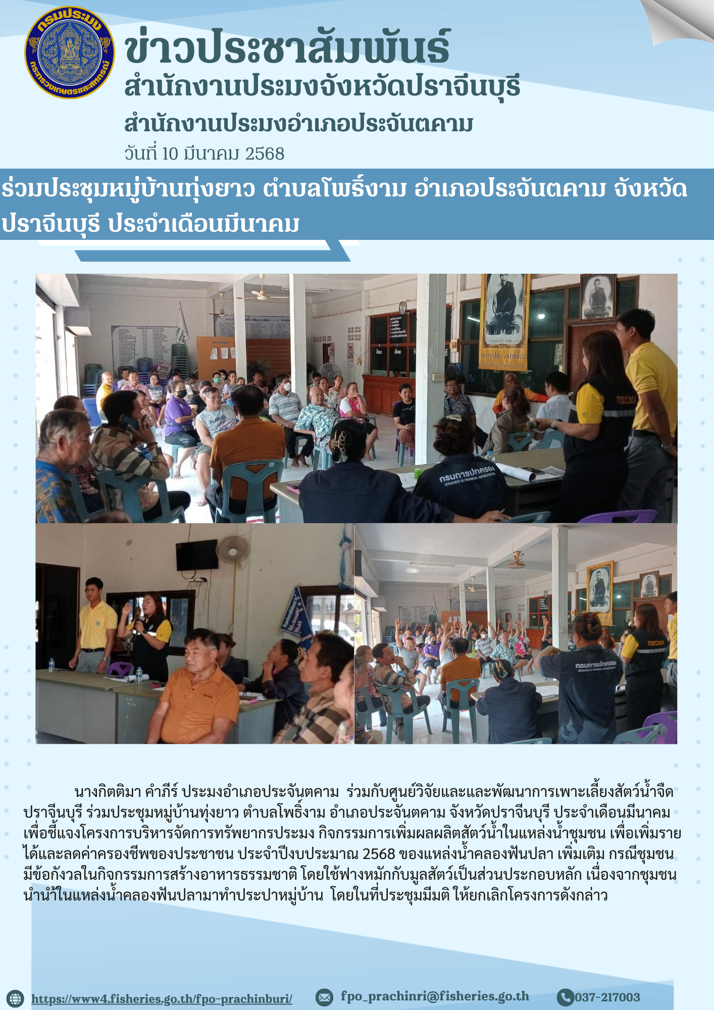 ข่าวประชาสัมพันธ์ สํานักงานประมงอำาเภอประจันตคาม ร่วมประชุมหมู่บ้านทุ่งยาว ตำบลโพธิ์งาม อำเภอประจันตคาม จังหวัดปราจีนบุรี ประจําเดือนมีนาคม