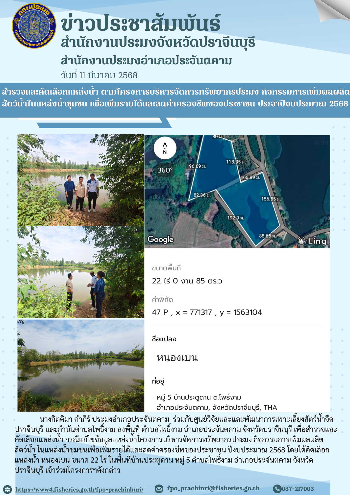 ข่าวประชาสัมพันธ์ สํานักงานประมงอำาเภอประจันตคาม สํารวจและคัดเลือกแหล่งนํ้า ตามโครงการบริหารจัดการทรัพยากรประมง กิจกรรมการเพิ่มผลผลิต สัตว์นํ้าในแหล่งน้ำชุมชน เพื่อเพิ่มรายได้และลดค่าครองชีพของประชาชน ประจําปีงบประมาณ 2568