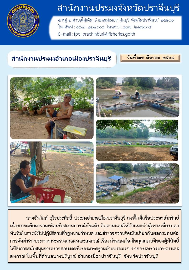 ข่าวประชาสัมพันธ์ สำนักงานประมงอำเภอเมืองปราจีนบุรี ลงพื้นที่เพื่อประชาสัมพันธ์ เรื่องการเตรียมความพร้อมรับสถานการณ์ภัยแล้ง ติดตามและให้คำแนะนำผู้เพาะเลี้ยงปลา ทับทิมในกระชังให้ปฏิบัติตามที่กฎหมายกำหนด