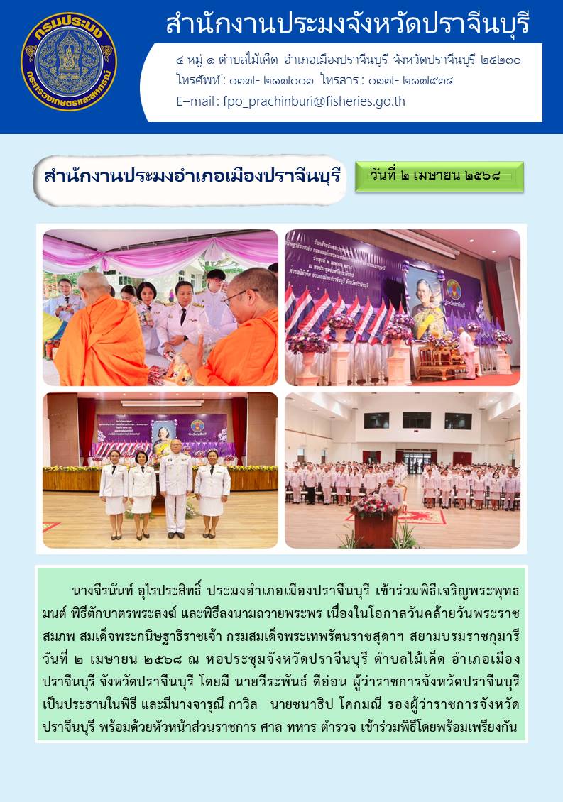 ข่าวประชาสัมพันธ์ สำนักงานประมงอำเภอเมืองปราจีนบุรี เข้าร่วมพิธีเจริญพระพุทธ มนต์ พิธีตักบาตรพระสงฆ์ และพิธีลงนามถวายพระพร เนื่องในโอกาสวันคล้ายวันพระราช สมภพ สมเด็จพระกนิษฐาธิราชเจ้า กรมสมเด็จพระเทพรัตนราชสุดาฯ สยามบรมราชกุมารี