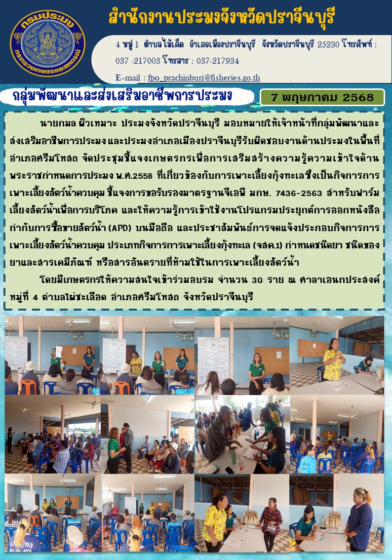 ข่าวประชาสัมพันธ์ กลุ่มพัฒนาและส่งเสริมอาชีพการประมง จัดประชุมชี้แจงเกษตรกรเพื่อการเสริมสร้างความรู้ความเข้าใจด้าน พระราชกำหนดการประมง พ.ศ.2558