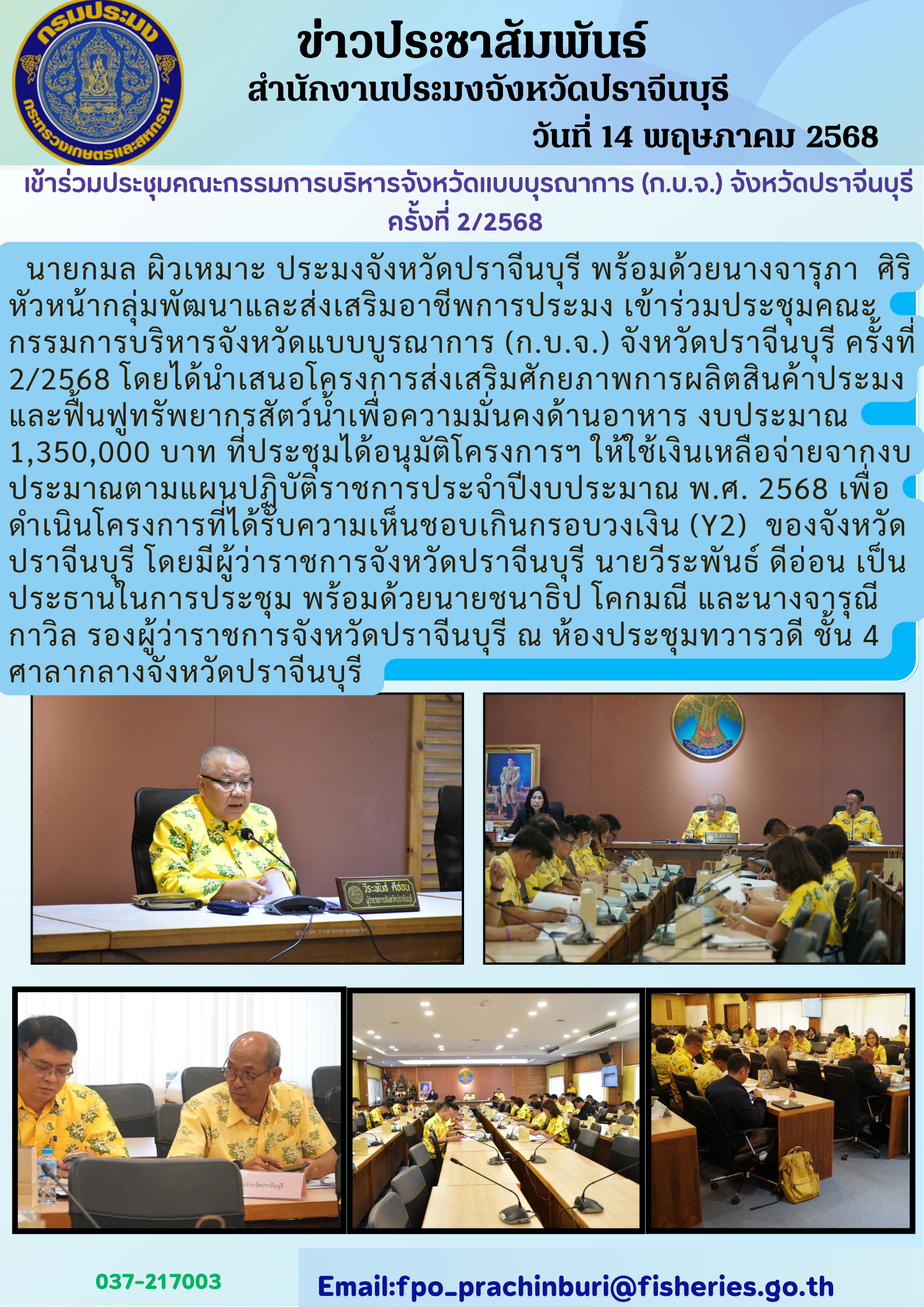 ข่าวประชาสัมพันธ์ เข้าร่วมประชุมคณะกรรมการบริหารจังหวัดแบบบูรณาการ (ก.บ.จ.) จังหวัดปราจีนบุรี ครั้งที่ 2/2568