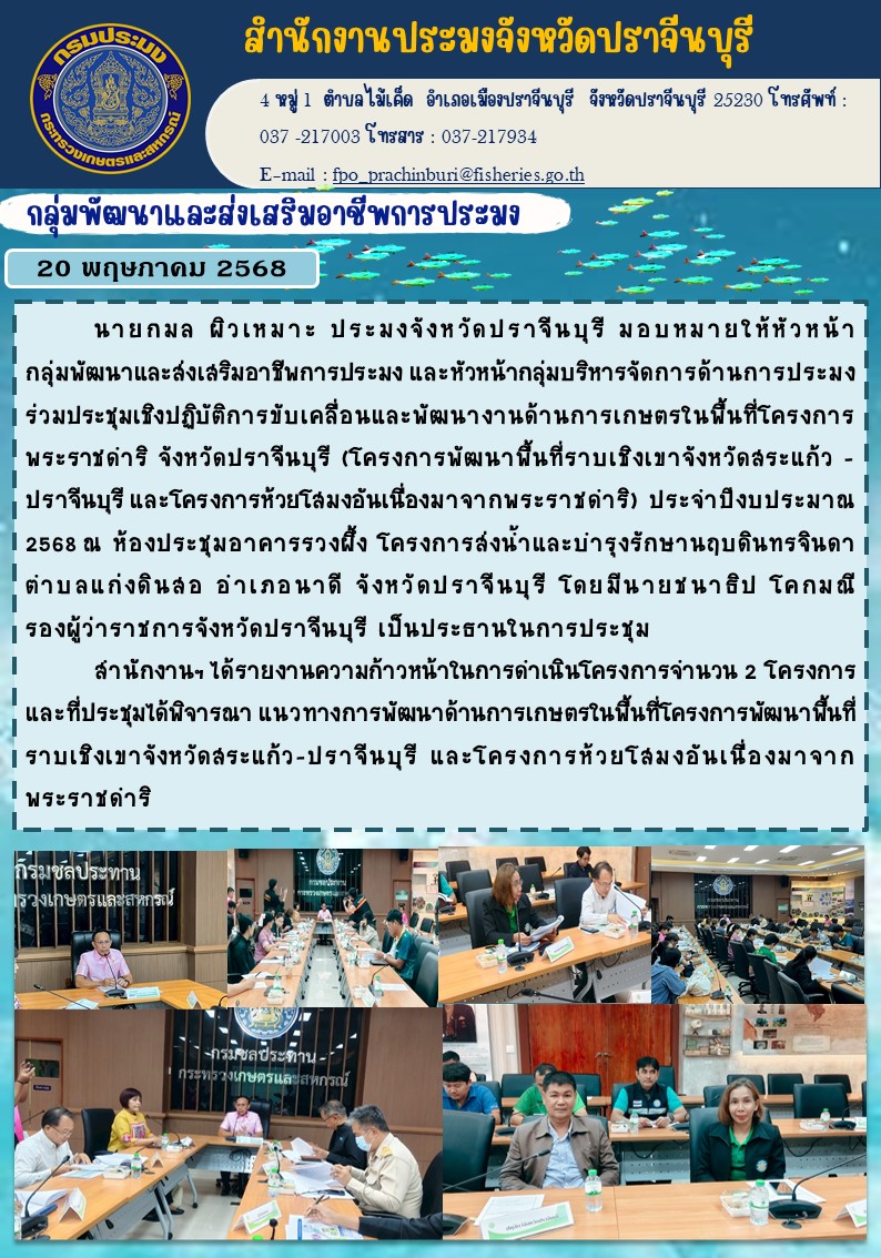 ข่าวประชาสัมพันธ์ กลุ่มพัฒนาและส่งเสริมอาชีพการประมง ร่วมประชุมเชิงปฏิบัติการขับเคลื่อนและพัฒนางานด้านการเกษตรในพื้นที่โครงการ พระราชดำาริ จังหวัดปราจีนบุรี (โครงการพัฒนาพื้นที่ราบเชิงเขาจังหวัดสระแก้ว ปราจีนบุรี และโครงการห้วยโสมงอันเนื่องมาจากพระราชดำาริ) ประจําปีงบประมาณ 1 2568