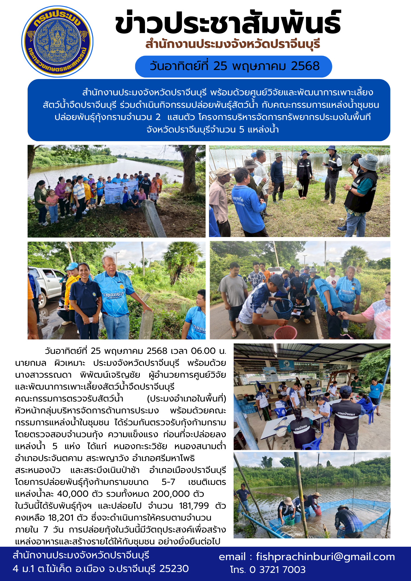 ข่าวประชาสัมพันธ์ ร่วมดำเนินกิจกรรมปล่อยพันธุ์สัตว์น้ำ กับคณะกรรมการแหล่งน้ำชุมชน ปล่อยพันธุ์กุ้งกรามจํานวน 2 แสนตัว โครงการบริหารจัดการทรัพยากรประมงในพื้นที จังหวัดปราจีนบุรีจํานวน 5 แหล่งน้ำ