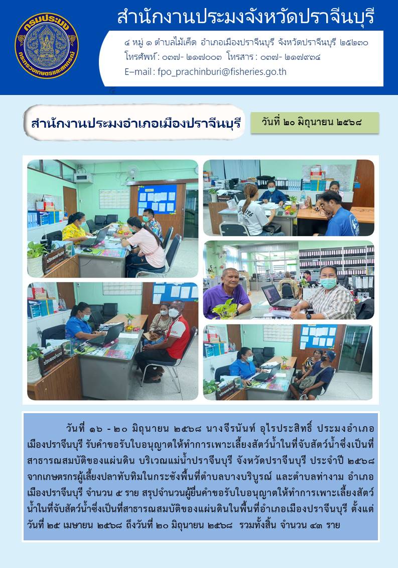 ข่าวประชาสัมพันธ์ สำนักงานประมงอำเภอเมืองปราจีนบุรี รับคำขอรับใบอนุญาตให้ทำการเพาะเลี้ยงสัตว์น้ำในที่จับสัตว์น้ำซึ่งเป็นที่ สาธารณสมบัติของแผ่นดิน บริเวณแม่น้ำปราจีนบุรี จังหวัดปราจีนบุรี ประจำปี ๒๕๖๘
