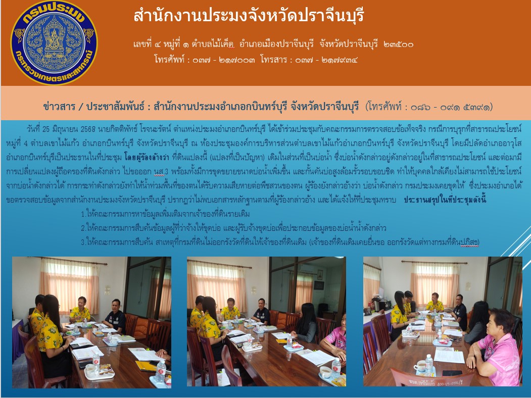 ข่าวประชาสัมพันธ์ สำนักงานประมงอำเภอกบินทร์บุรี เข้าร่วมประชุมกับคณะกรรมการตรวจสอบข้อเท็จจริง กรณีการบุรุกที่สาธารณประโยชน์