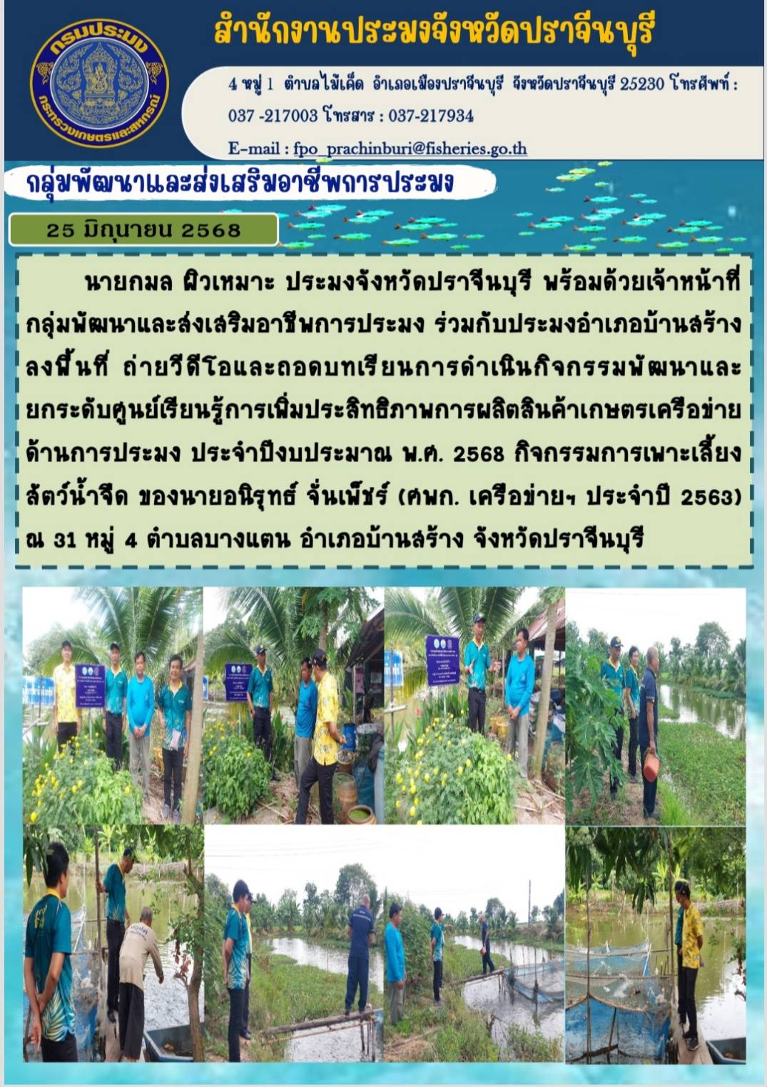 ข่าวประชาสัมพันธ์ กลุ่มพัฒนาและส่งเสริมอาชีพการประมง ลงพื้นที่ ถ่ายวีดีโอและถอดบทเรียนการดำเนินกิจกรรมพัฒนาและ ยกระดับศูนย์เรียนรู้การเพิ่มประสิทธิภาพการผลิตสินค้าเกษตรเครือข่าย ด้านการประมง ประจำปีงบประมาณ พ.ศ. 2568