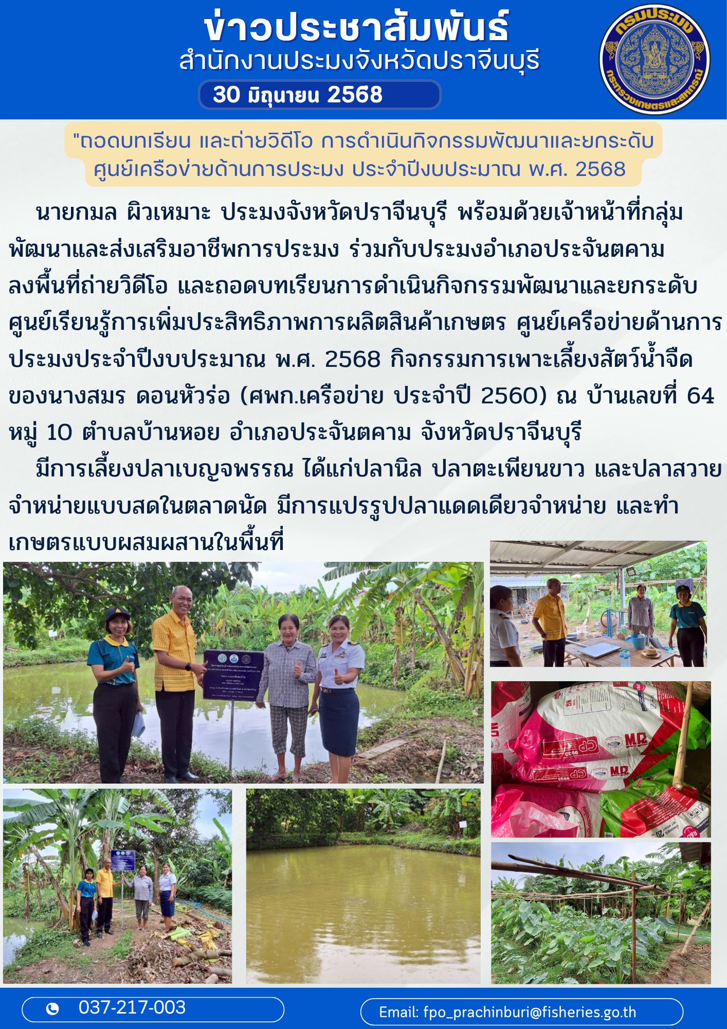 ข่าวประชาสัมพันธ์ ลงพื้นที่ถ่ายวิดีโอ และถอดบทเรียนการดำเนินกิจกรรมพัฒนาและยกระดับ ศูนย์เรียนรู้การเพิ่มประสิทธิภาพการผลิตสินค้าเกษตร ศูนย์เครือข่ายด้านการ ประมงประจำปีงบประมาณ พ.ศ. 2568