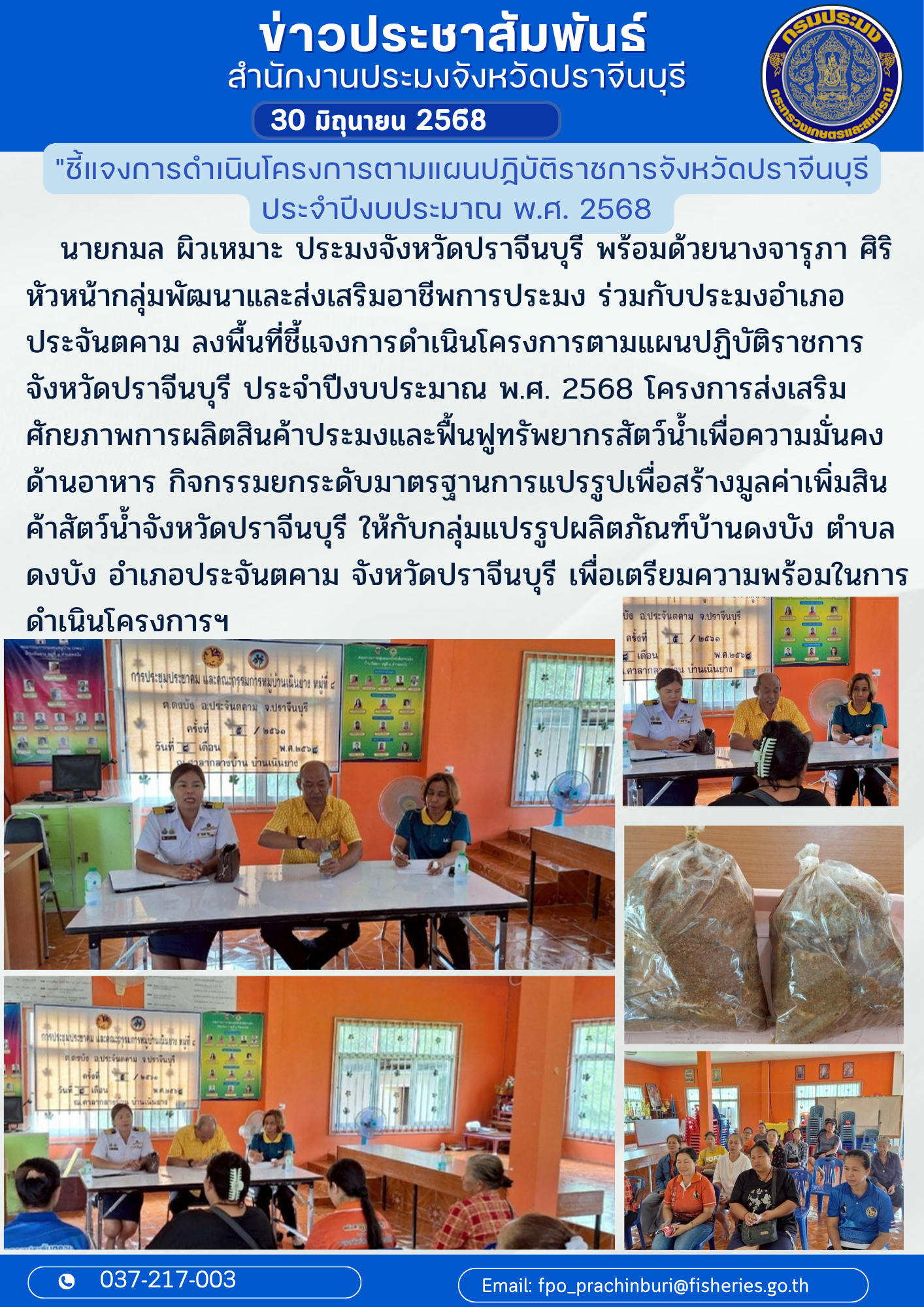 ข่าวประชาสัมพันธ์ ลงพื้นที่ชี้แจงการดำเนินโครงการตามแผนปฏิบัติราชการ จังหวัดปราจีนบุรี ประจำปีงบประมาณ พ.ศ. 2568 โครงการส่งเสริม ศักยภาพการผลิตสินค้าประมงและฟื้นฟูทรัพยากรสัตว์น้ำเพื่อความมั่นคง ด้านอาหาร