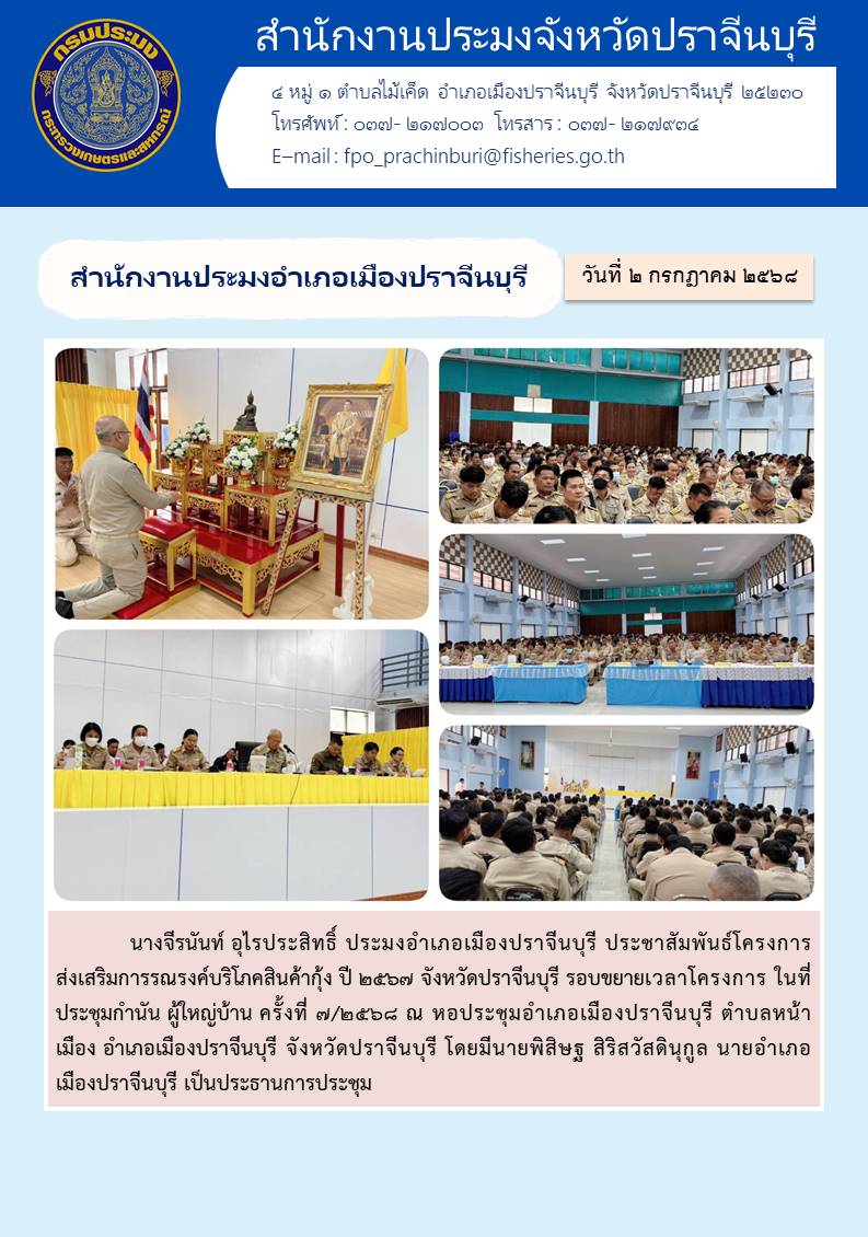 ข่าวประชาสัมพันธ์ สำนักงานประมงอำเภอเมืองปราจีนบุรี ประชาสัมพันธ์โครงการ ส่งเสริมการรณรงค์บริโภคสินค้ากุ้ง ปี ๒๕๖๗ จังหวัดปราจีนบุรี รอบขยายเวลาโครงการ ในที่ ประชุมกำนัน ผู้ใหญ่บ้าน ครั้งที่ 7/2568