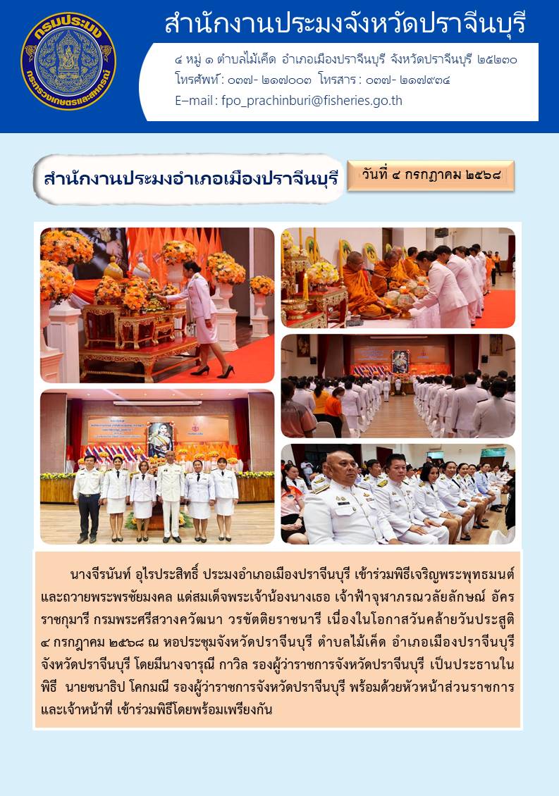 ข่าวประชาสัมพันธ์ สำนักงานประมงอำเภอเมืองปราจีนบุรี เข้าร่วมพิธีเจริญพระพุทธมนต์ และถวายพระพรชัยมงคล แด่สมเด็จพระเจ้าน้องนางเธอ เจ้าฟ้าจุฬาภรณวลัยลักษณ์ อัคร ราชกุมารี กรมพระศรีสวางควัฒนา วรขัตติยราชนารี เนื่องในโอกาสวันคล้ายวันประสูติ ๔ กรกฎาคม ๒๕๖๘