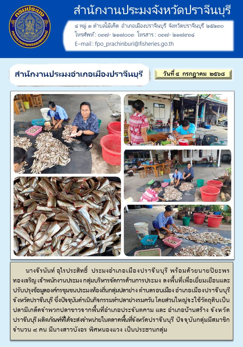 ข่าวประชาสัมพันธ์ สำนักงานประมงอำเภอเมืองปราจีนบุรี ลงพื้นที่เพื่อเยี่ยมเยือนและ ปรับปรุงข้อมูลองค์กรชุมชนประมงท้องถิ่นกลุ่มปลาย่าง ตำบลรอบเมือง อำเภอเมืองปราจีนบุรี จังหวัดปราจีนบุรี