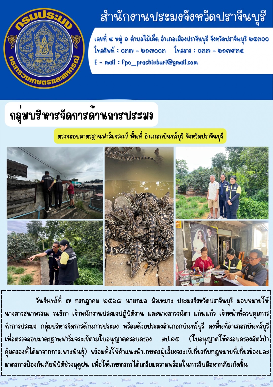 ข่าวประชาสัมพันธ์ กลุ่มบริหารจัดการด้านการประมง ลงพื้นที่อำเภอกบินทร์บุรี เพื่อตรวจสอบมาตรฐานฟาร์มจระเข้ตามใบอนุญาตครอบครอง สป.๑๕