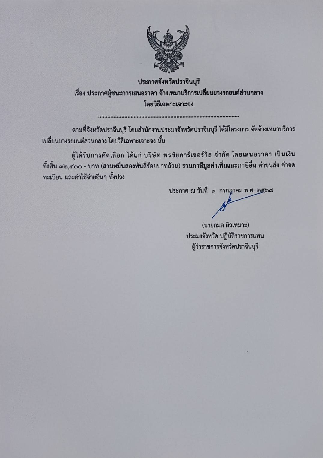 เรื่อง ประกาศผู้ชนะการเสนอราคา จ้างเหมาบริการเปลี่ยนยางรถยนต์ส่วนกลาง