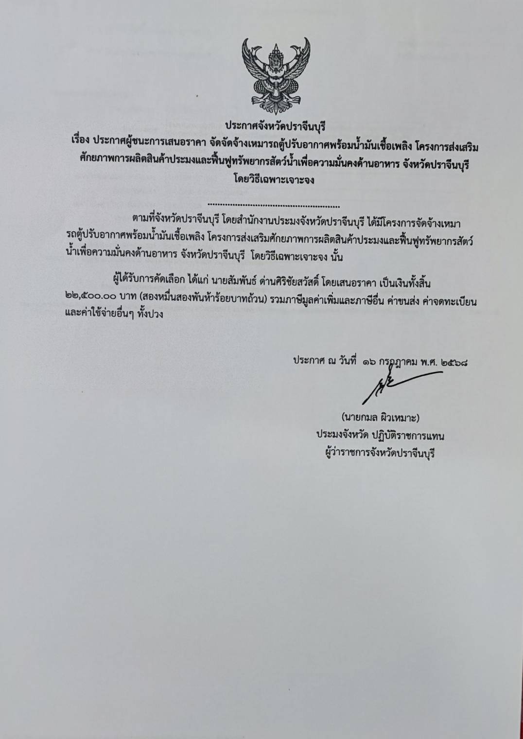 จัดจ้างเหมารถตู้ปรับอากาศพร้อมน้ำมันเชื้อเพลิง โครงการส่งเสริมศักยภาพการผลิตสินค้าประมงและฟื้นฟูทรัพยากรสัตว์น้ำเพื่อความมั่นคงด้านอาหาร จังหวัดปราจีนบุรี