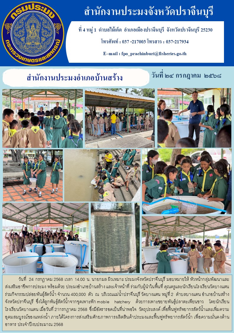 ข่าวประชาสัมพันธ์ สำนักงานประมงอำเภอบ้านสร้าง ร่วมกิจกรรมปล่อยพันธุ์สัตว์น้ำ จำนวน 400,000 ตัว ณ บริเวณแม่น้ำปราจีนบุรีวัดบางแตน