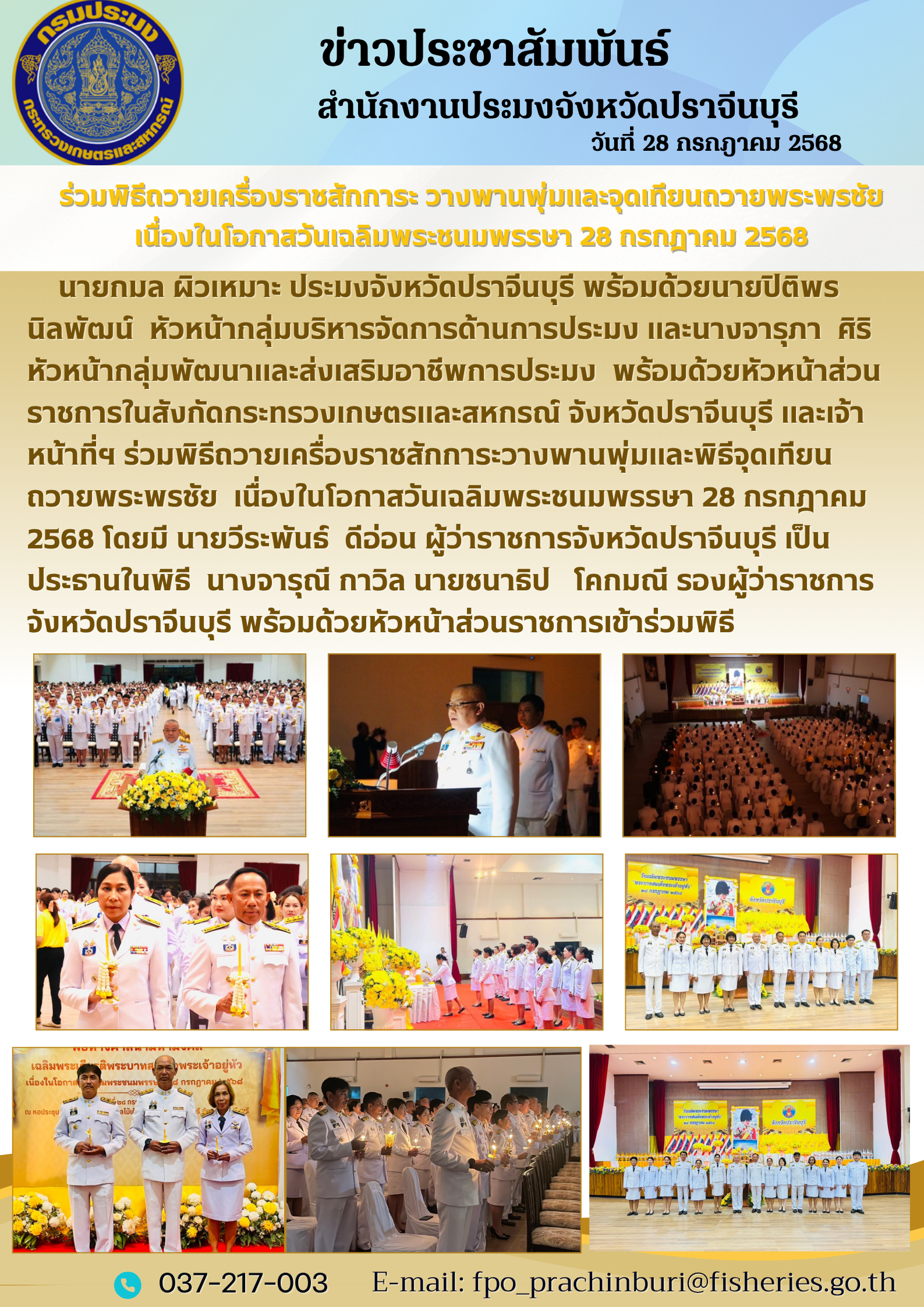 ข่าวประชาสัมพันธ์ ร่วมพิธีถวายเครื่องราชสักการะ วางพานพุ่มและจุดเทียนถวายพระพรชัย เนื่องในโอกาสวันเฉลิมพระชนมพรรษา 28 กรกฎาคม 2568