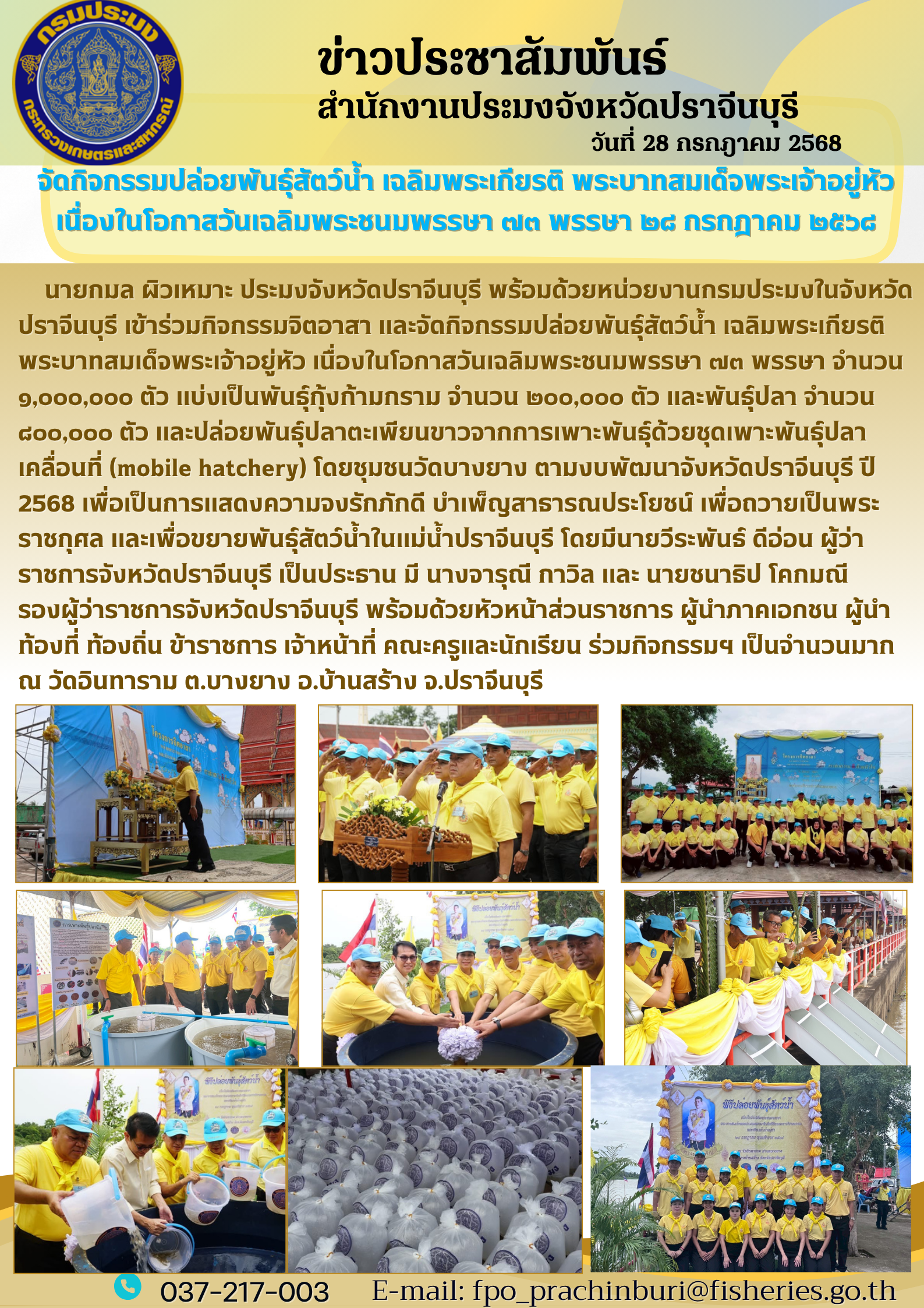ข่าวประชาสัมพันธ์ จัดกิจกรรมปล่อยพันธุ์สัตว์นํ้า เฉลิมพระเกียรติ พระบาทสมเด็จพระเจ้าอยู่หัว เนื่องในโอกาสวันเฉลิมพระชนมพรรษา ๗๓ พรรษา ๒๘ กรกฎาคม ๒๕๖๘