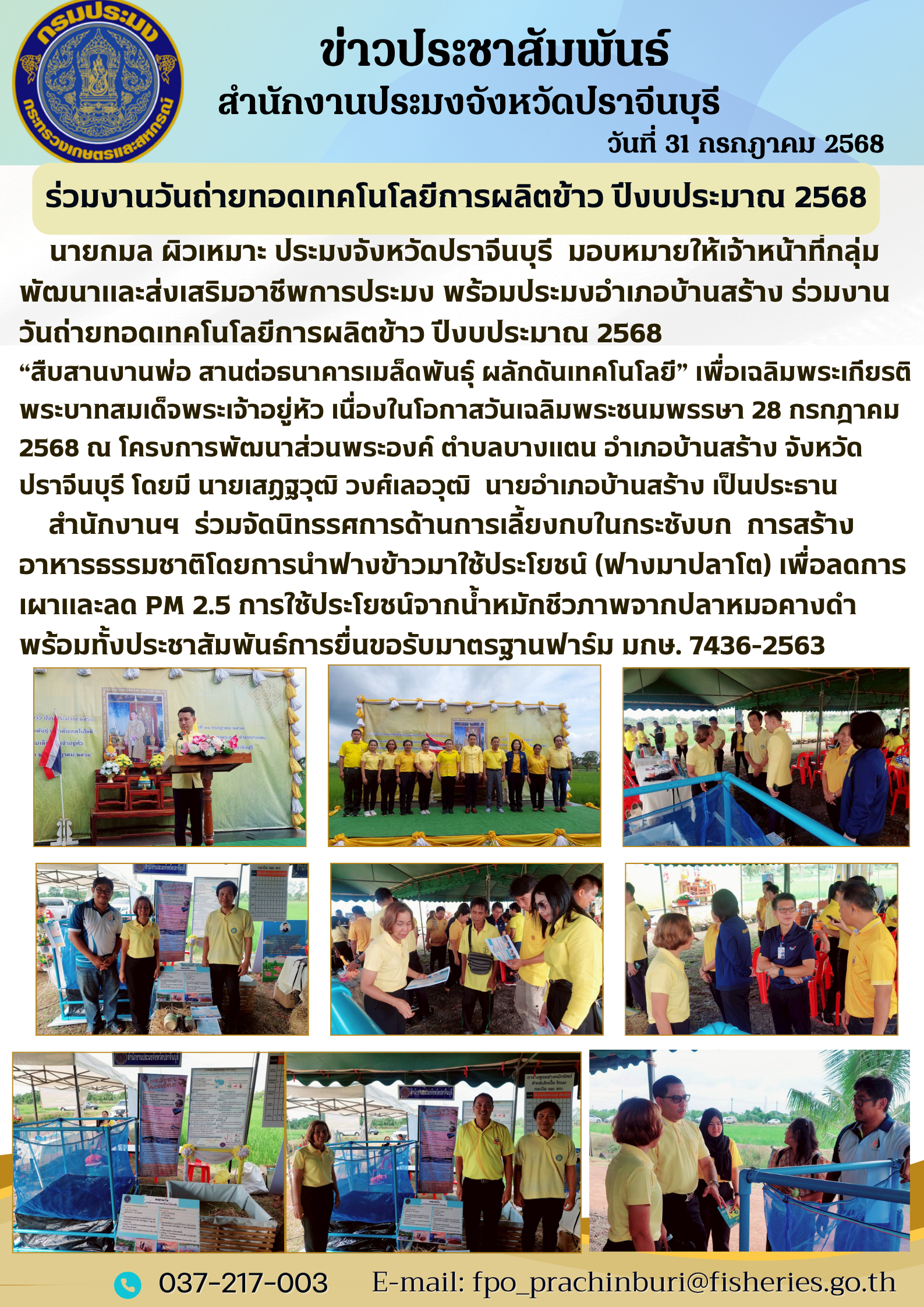 ข่าวประชาสัมพันธ์ ร่วมงานวันถ่ายทอดเทคโนโลยีการผลิตข้าว ปีงบประมาณ 2568 “สืบสานงานพ่อ สานต่อธนาคารเมล็ดพันธุ์ ผลักดันเทคโนโลยี” เพื่อเฉลิมพระเกียรติ พระบาทสมเด็จพระเจ้าอยู่หัว เนื่องในโอกาสวันเฉลิมพระชนมพรรษา 28 กรกฎาคม 2568