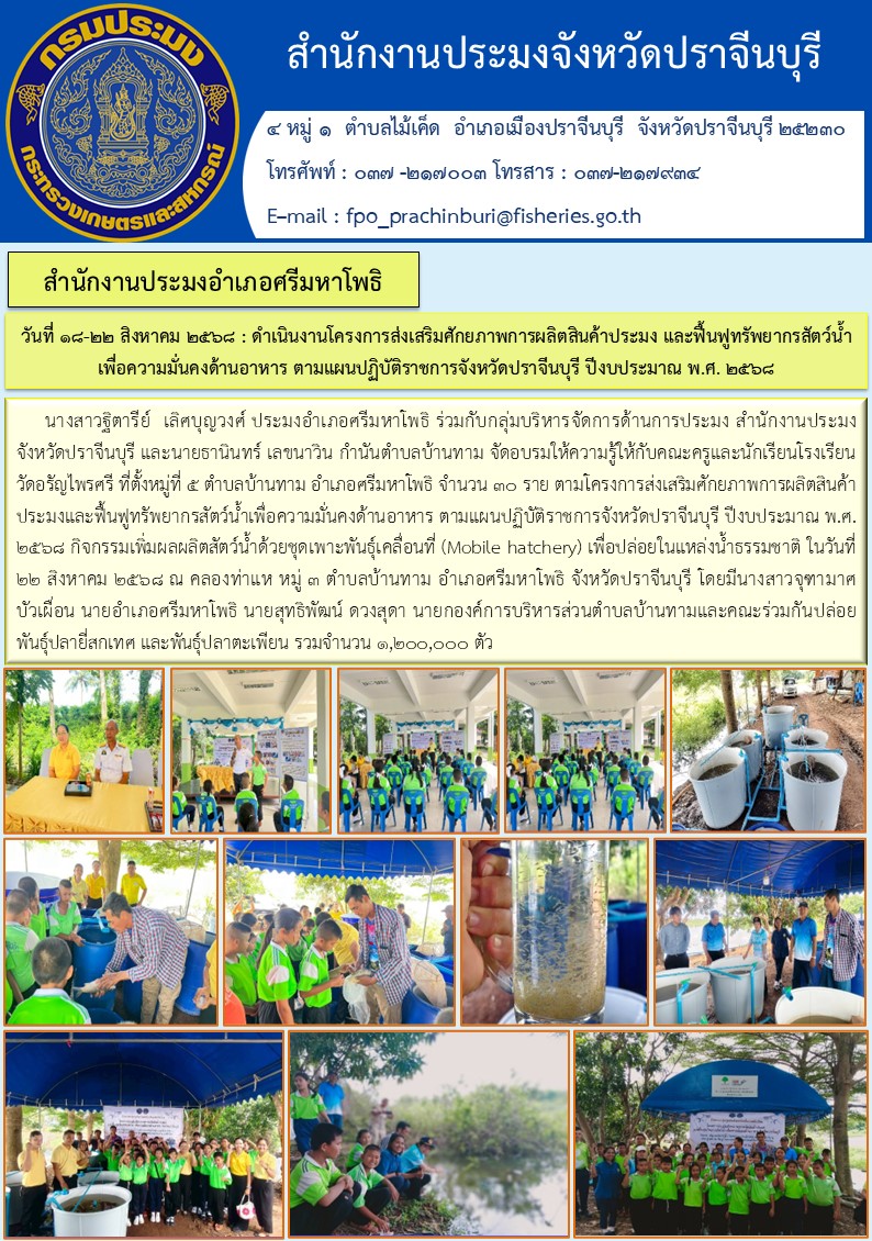 ข่าวประชาสัมพันธ์ สำนักงานประมงอำเภอศรีมหาโพธิ จัดอบรมให้ความรู้ให้กับคณะครูและนักเรียนโรงเรียนวัดอรัญไพรศรี