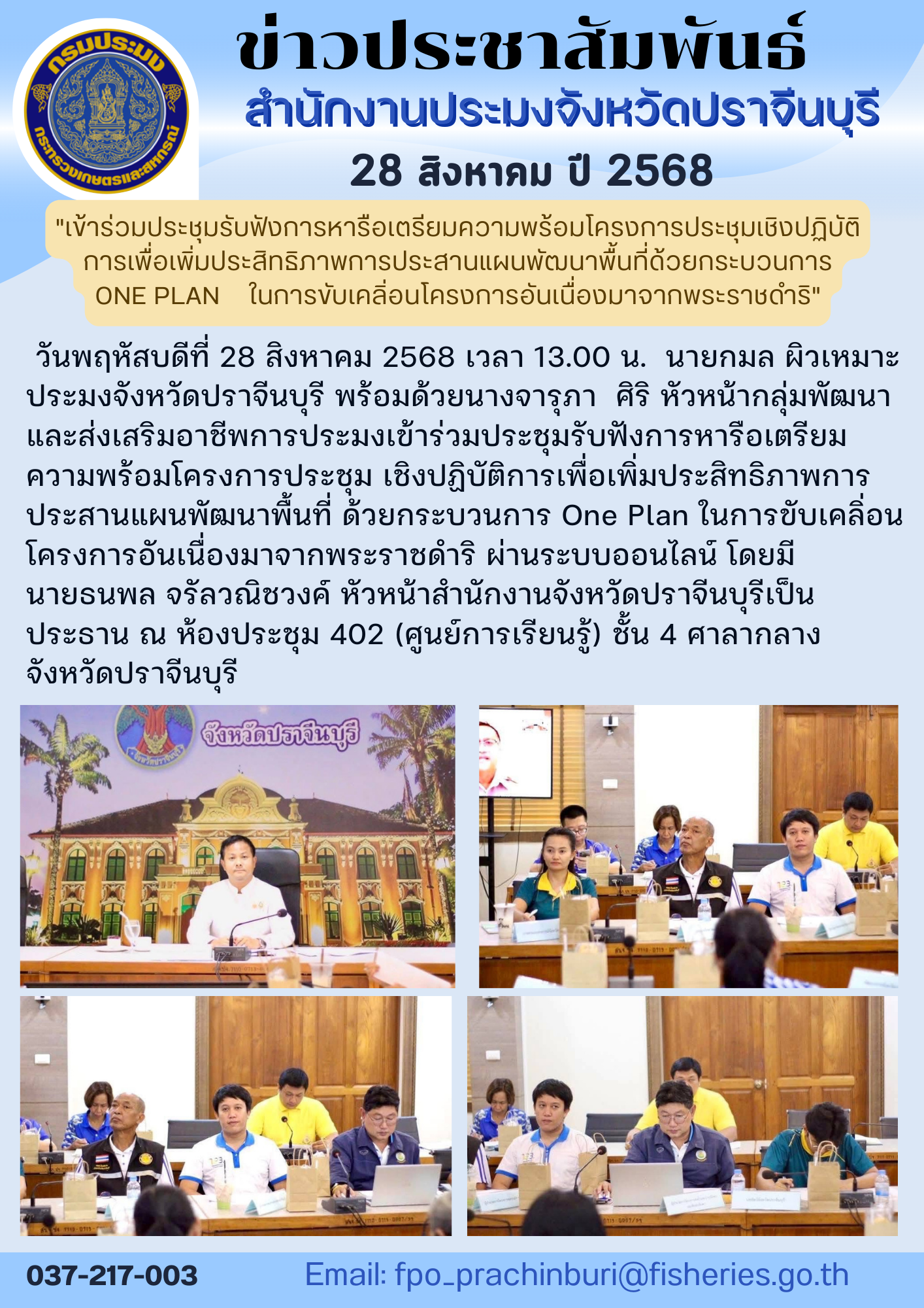 ข่าวประชาสัมพันธ์ เข้าร่วมประชุมรับฟังการหารือเตรียมความพร้อมโครงการประชุมเชิงปฏิบัติ การเพื่อเพิ่มประสิทธิภาพการประสานแผนพัฒนาพื้นที่ด้วยกระบวนการ ONE PLAN ในการขับเคลื่อนโครงการอันเนื่องมาจากพระราชดำริ