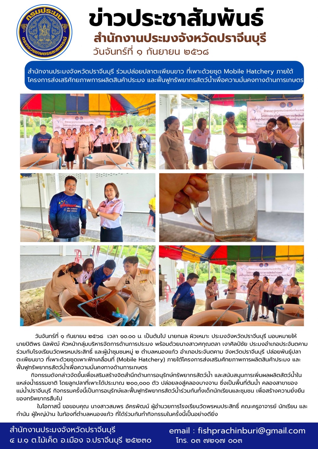 ข่าวประชาสัมพันธ์ ร่วมกับโรงเรียนวัดพรหมประสิทธิ์ และผู้นำชุมชนหมู่ ๒ ตำบลหนองแก้ว อำเภอประจันตคาม จังหวัดปราจีนบุรี ปล่อยพันธุ์ปลา ตะเพียนขาว ที่เพาะด้วยชุดเพาะฟักเคลื่อนที่ (Mobile Hatchery) ภายใต้โครงการส่งเสริมศักยภาพการผลิตสินค้าประมง และ ฟื้นฟูทรัพยากรสัตว์นํ้าเพื่อความมั่นคงทางด้านการเกษตร