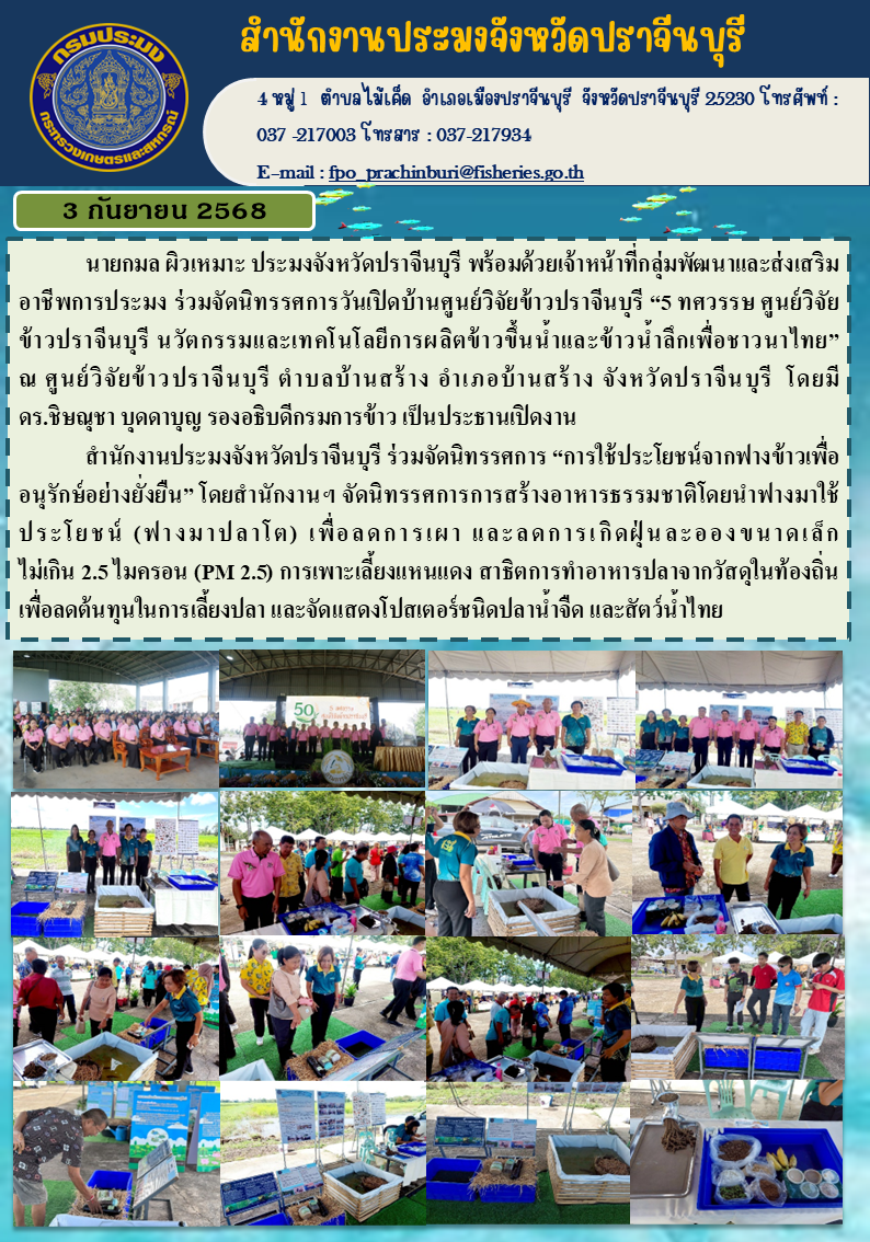 ข่าวประชาสัมพันธ์ ร่วมจัดนิทรรศการวันเปิดบ้านศูนย์วิจัยข้าวปราจีนบุรี “5 ทศวรรษ ศูนย์วิจัย ข้าวปราจีนบุรี นวัตกรรมและเทคโนโลยีการผลิตข้าวขึ้นน้ำและข้าวน้ำลึกเพื่อชาวนาไทย”