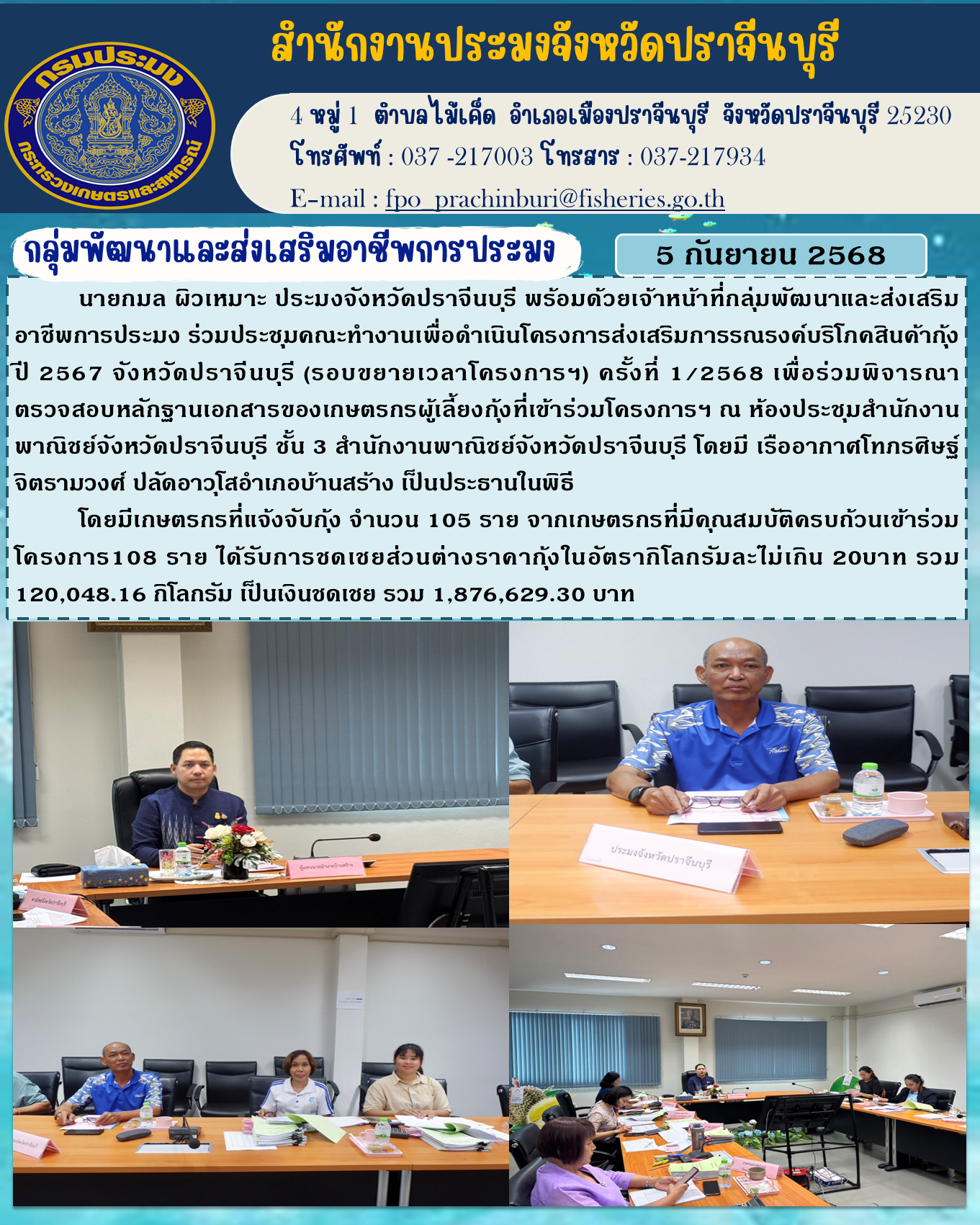 ข่าวประชาสัมพันธ์ กลุ่มพัฒนาและส่งเสริมอาชีพการประมง ร่วมประชุมคณะทำงานเพื่อดำเนินโครงการส่งเสริมการรณรงค์บริโภคสินค้ากุ้ง ปี 2567 จังหวัดปราจีนบุรี (รอบขยายเวลาโครงการฯ) ครั้งที่ 1/2568 เพื่อร่วมพิจารณา ตรวจสอบหลักฐานเอกสารของเกษตรกรผู้เลี้ยงกุ้งที่เข้าร่วมโครงการฯ