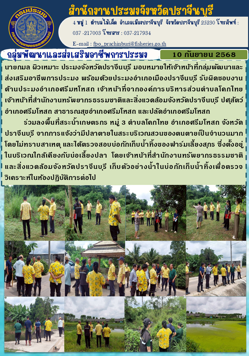ข่าวประชาสัมพันธ์ กลุ่มพัฒนาและส่งเสริมอาชีพการประมง ลงพื้นที่สระน้ำเกษตรกร หมู่ 3 ตำบลโคกไทย อำเภอศรีมโหสถ จังหวัดปราจีนบุรี