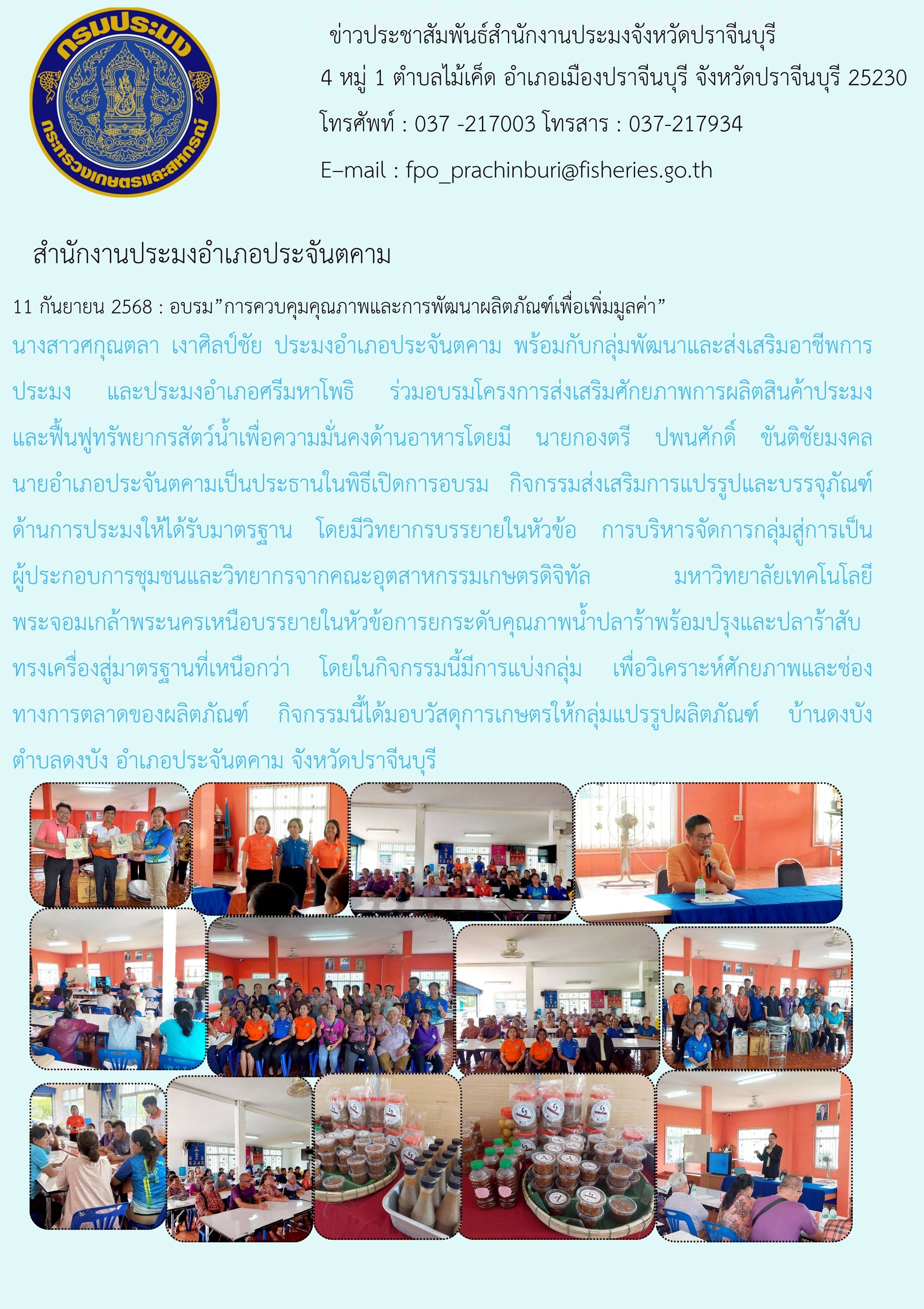 ข่าวประชาสัมพันธ์ สำนักงานประมงอำเภอประจันตคาม ร่วมอบรมโครงการส่งเสริมศักยภาพการผลิตสินค้าประมง และฟื้นฟูทรัพยากรสัตว์น้ำเพื่อความมั่นคงด้านอาหาร