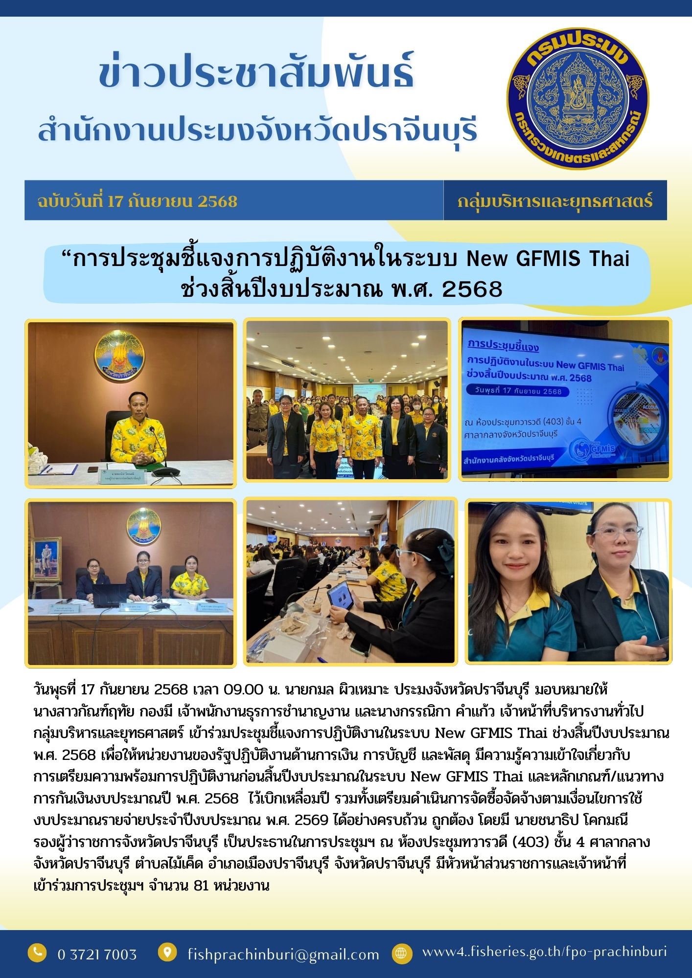 ข่าวประชาสัมพันธ์ กลุ่มบริหารและยุทรศาสตร์ เข้าร่วมประชุมชี้แจงการปฏิบัติงานในระบบ New GFMIS Thai ช่วงสิ้นปีงบประมาณ พ.ศ. 2568