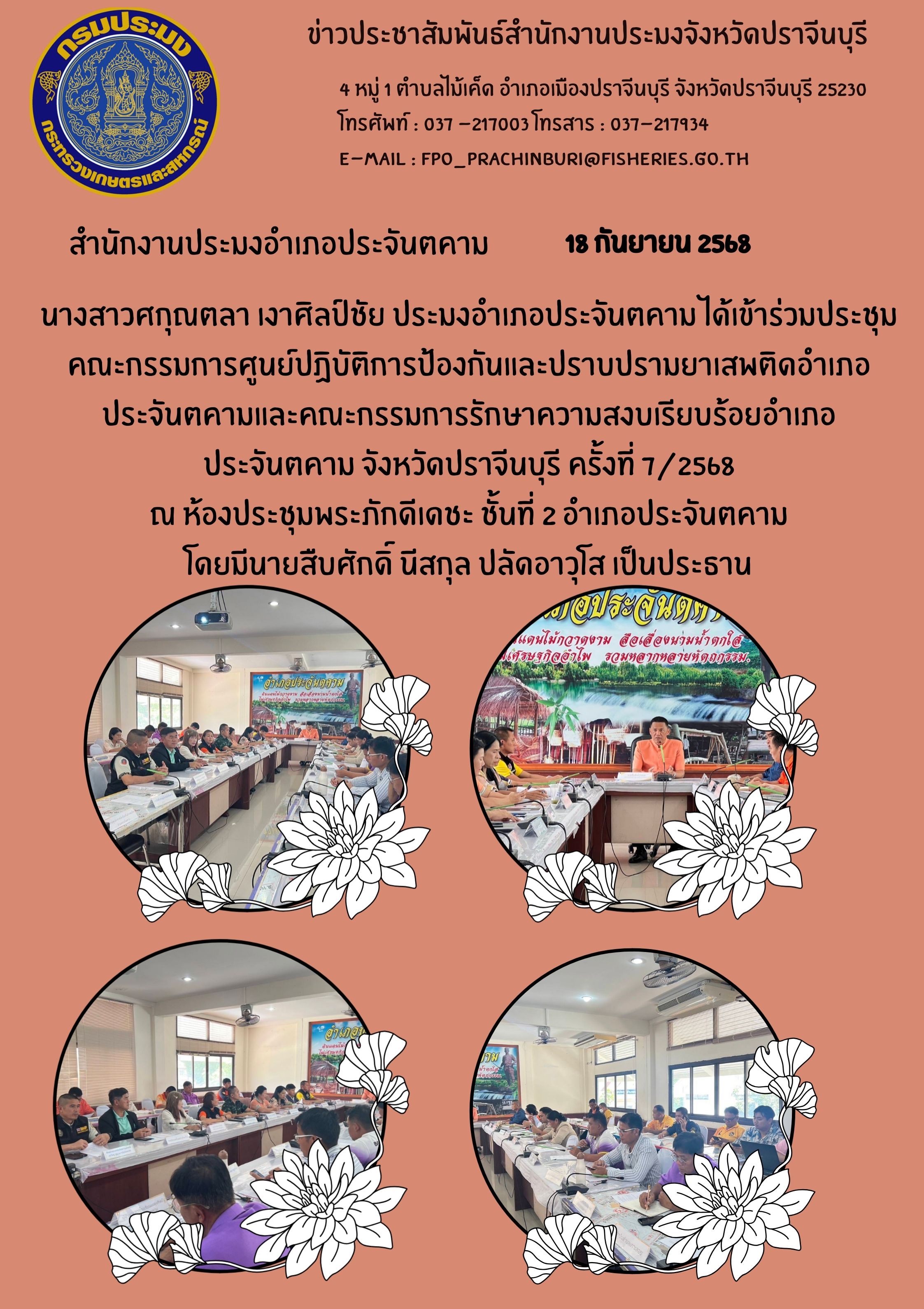 ข่าวประชาสัมพันธ์ สำนักงานประมงอำเภอประจันตคาม เข้าร่วมประชุม คณะกรรมการศูนย์ปฏิบัติการป้องกันและปราบปรามยาเสพติดอำเภอประจันตคาม