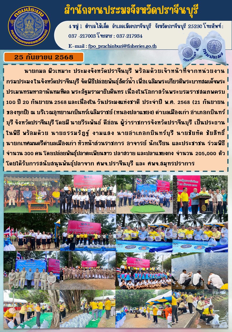 ข่าวประชาสัมพันธ์ จัดพิธีปล่อยพันธุ์สัตว์น้ำ เพื่อเฉลิมพระเกียรติพระบาทสมเด็จพระ ปรเมนทรมหาอานันทมหิดล พระอัฐมรามาธิบดินทร เนื่องในโอกาสวันพระบรมราชสมภพครบ | 100 ปี 20 กันยายน 2568