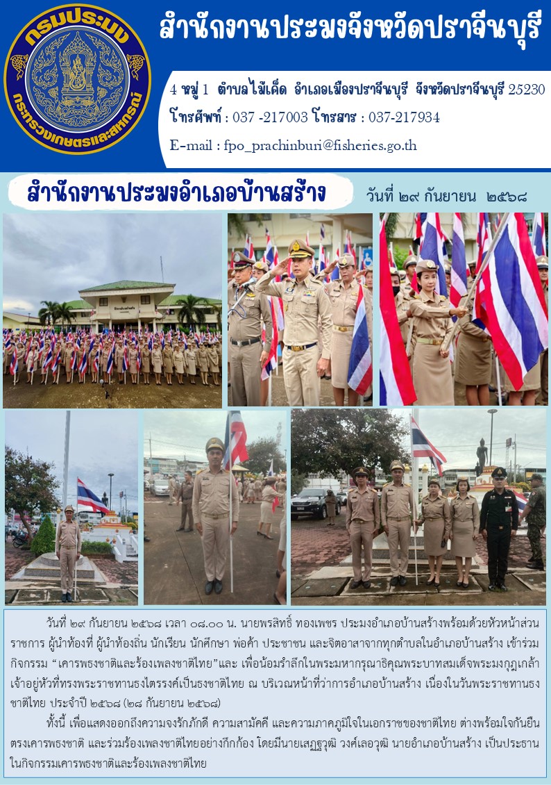 ข่าวประชาสัมพันธ์ สำนักงานประมงอำเภอบ้านสร้าง เข้าร่วม กิจกรรม “เคารพธงชาติและร้องเพลงชาติไทย” และ เพื่อน้อมรำลึกในพระมหากรุณาธิคุณพระบาทสมเด็จพระมงกุฎเกล้า เจ้าอยู่หัวที่ทรงพระราชทานธงไตรรงค์เป็นธงชาติไทย