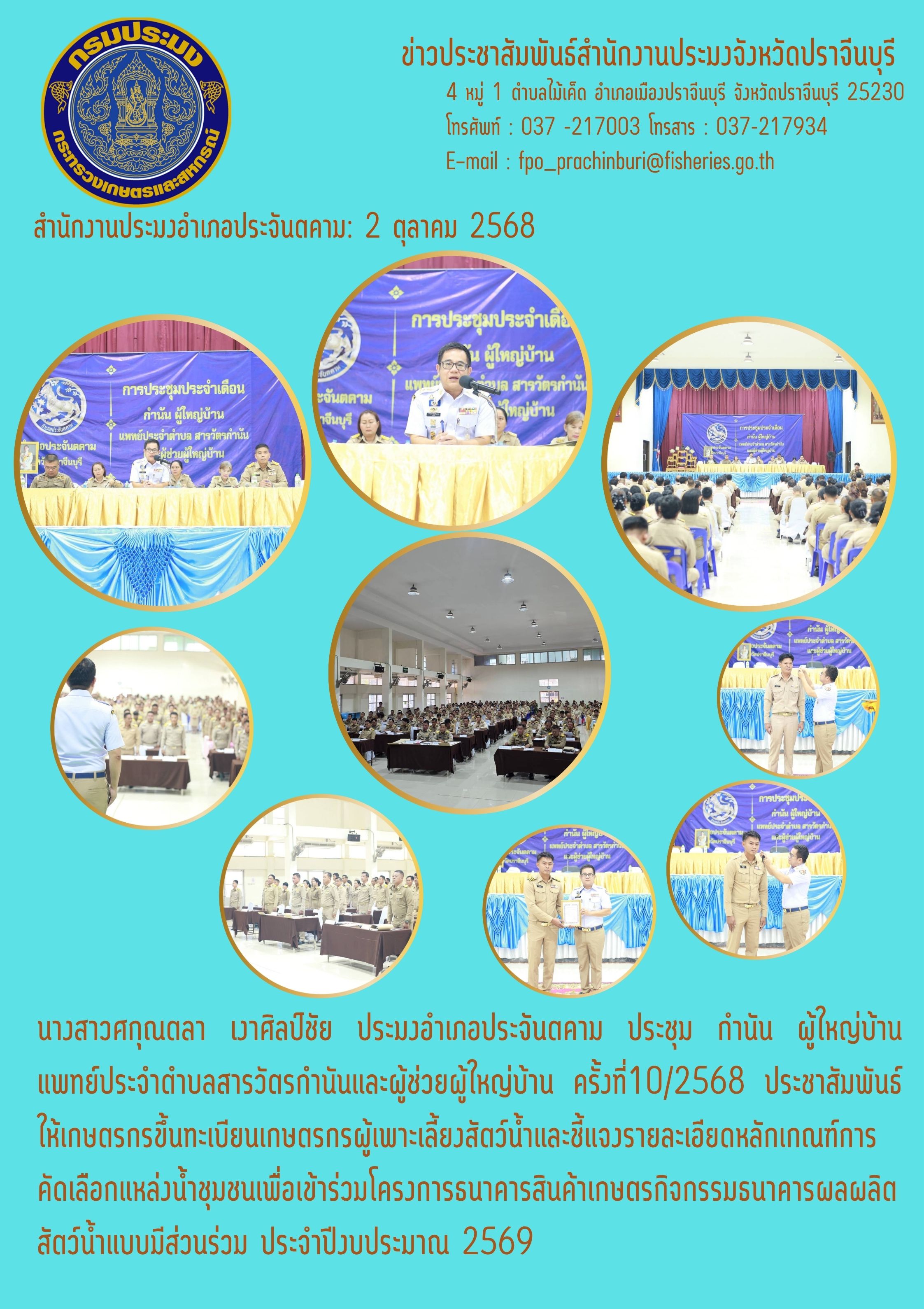 ข่าวประชาสัมพันธ์ สำนักงานประมงอำเภอประจันตคาม ประชุม กำนัน ผู้ใหญ่บ้าน แพทย์ประจำตำบลสารวัตรกำนันและผู้ช่วยผู้ใหญ่บ้าน ครั้งที่ 10/2568