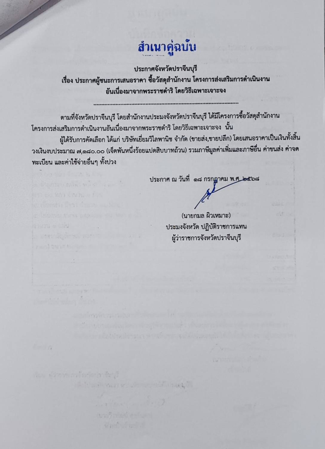 ประกาศผู้ชนะการเสนอราคา ซื้อวัสดุสำนักงาน โครงการส่งเสริมการดำเนินงาน อันเนื่องมาจากพระราชดำริ โดยวิธีเฉพาะเจาะจง