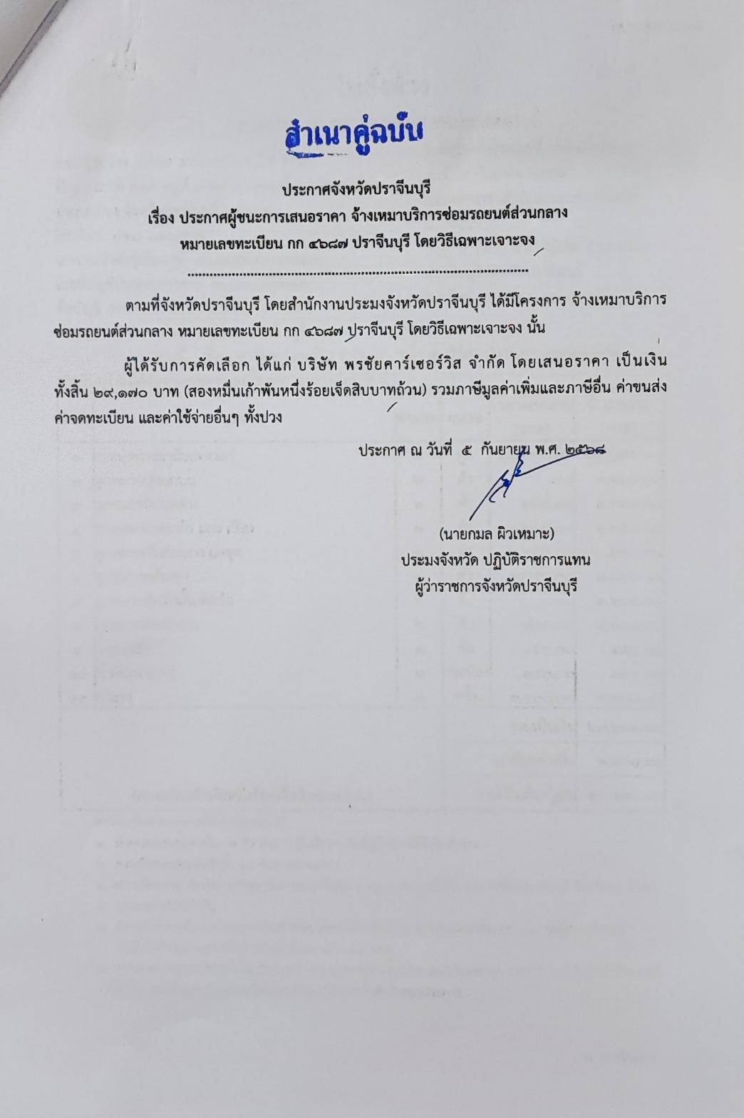 ประกาศผู้ชนะการเสนอราคา จ้างเหมาบริการซ่อมบำรุงรักษารถยนต์ราชการ ทะเบียน กก 4687 ปราจีนบุรี โดยวิธีเฉพาะเจาะจง