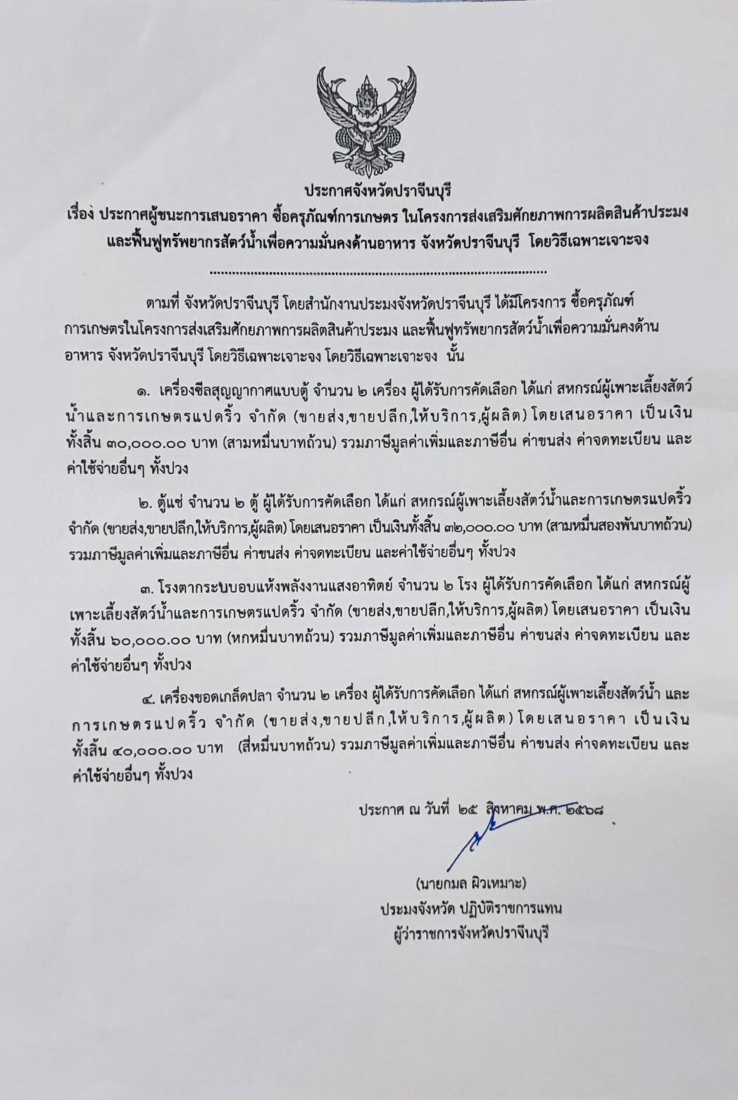 ซื้อครุภัณฑ์การเกษตร ในโครงการส่งเสริมศักยภาพการผลิตสินค้าประมง และฟื้นฟูทรัพยากรสัตว์น้ำเพื่อความมั่นคงด้านอาหาร จังหวัดปราจีนบุรี