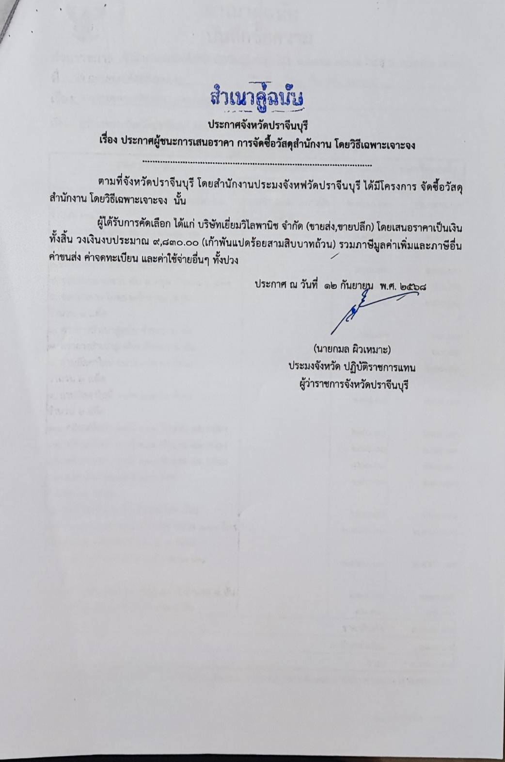 ประกาศผู้ชนะการเสนอราคา จัดซื้อวัสดุสำนักงาน โดยวิธีเฉพาะเจาะจง