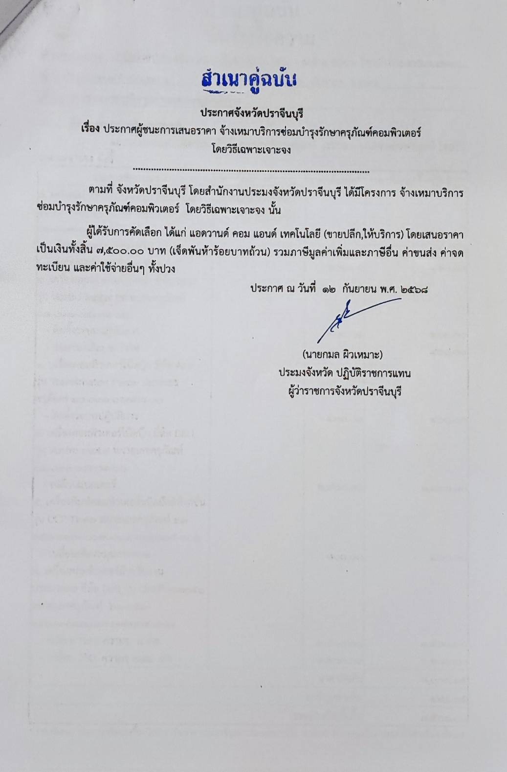 ประกาศผู้ชนะการเสนอราคา จ้างเหมาบริการซ่อมบำรุงรักษาครุภัณฑ์คอมพิวเตอร์ โดยวิธีเฉพาะเจาะจง