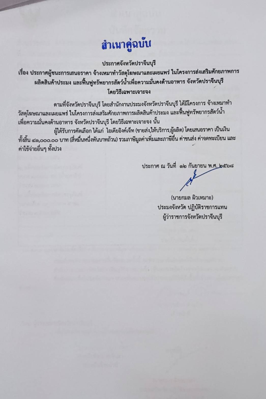 ประกาศผู้ชนะการเสนอราคา จ้างเหมาทำวัสดุโฆษณาและเผยแพร่ ในโครงการส่งเสริมศักยภาพการผลิตสินค้าประมง และฟื้นฟูทรัพยากรสัตว์น้ำเพื่อความมั่นคงด้านอาหาร จังหวัดปราจีนบุรี   โดยวิธีเฉพาะเจาะจง