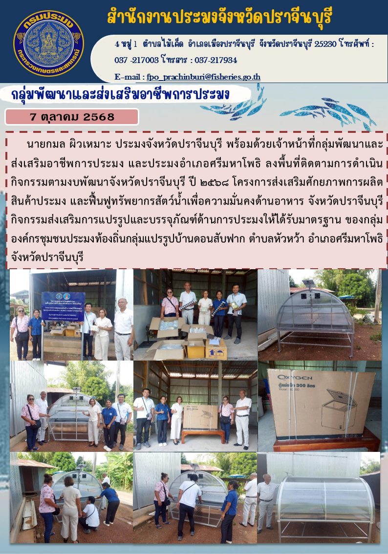 ข่าวประชาสัมพันธ์ กลุ่มพัฒนาและส่งเสริมอาชีพการประมง ลงพื้นที่ติดตามการดำเนิน | กิจกรรมตามงบพัฒนาจังหวัดปราจีนบุรี ปี ๒๕๖๘ โครงการส่งเสริมศักยภาพการผลิต สินค้าประมง และฟื้นฟูทรัพยากรสัตว์น้ำเพื่อความมั่นคงด้านอาหาร จังหวัดปราจีนบุรี
