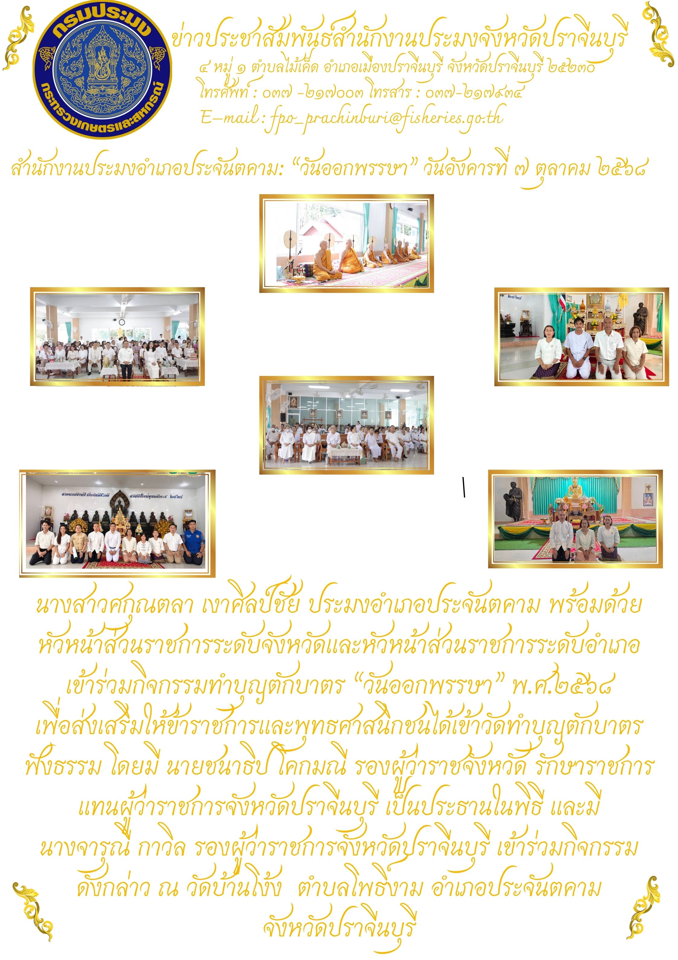 ข่าวประชาสัมพันธ์ สำนักงานประมงอำเภอประจันตคาม เข้าร่วมกิจกรรมทำบุญตักบาตร “วันออกพรรษา” พ.ศ.2568