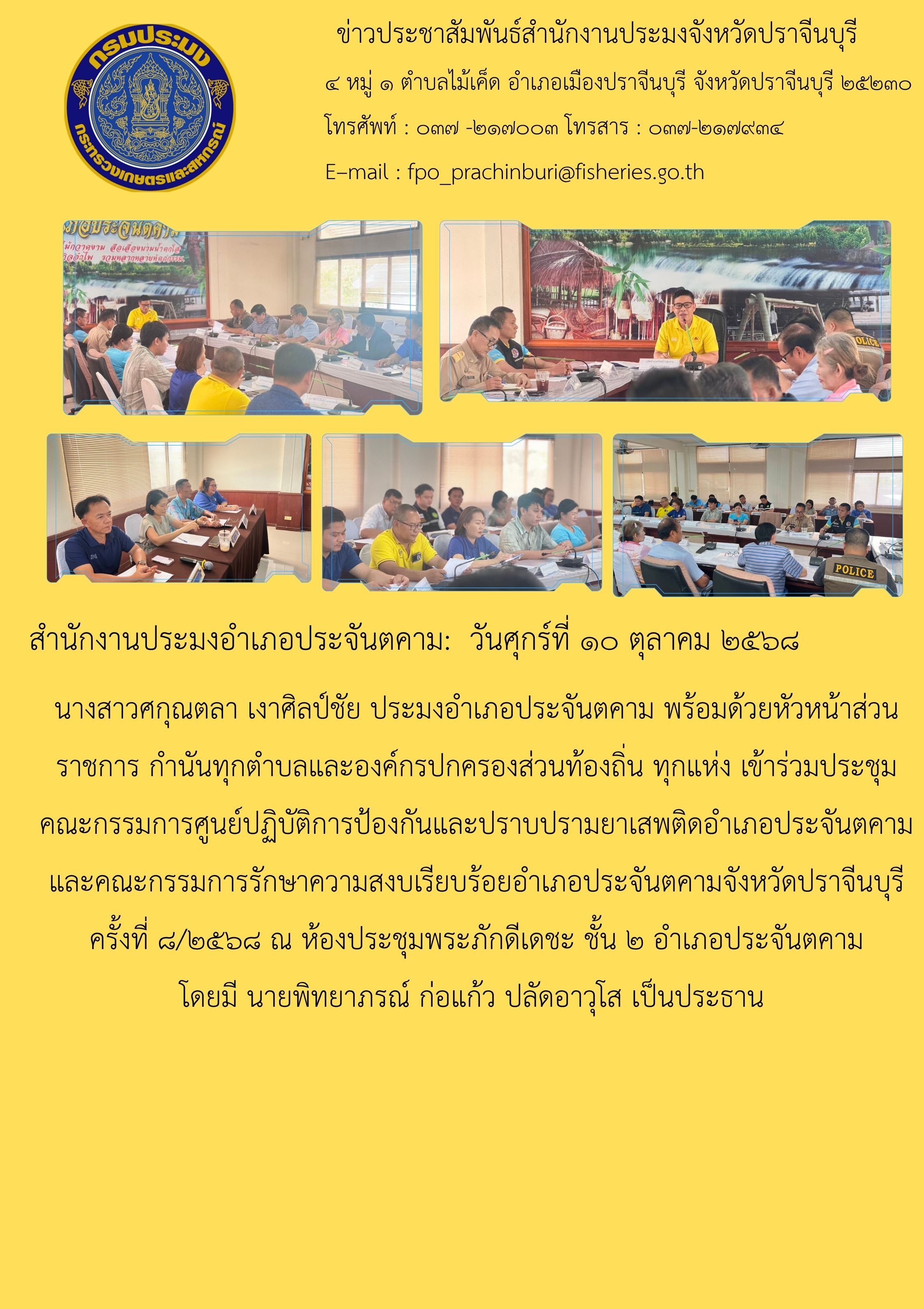 ข่าวประชาสัมพันธ์ สำนักงานประมงอำเภอประจันตคาม เข้าร่วมประชุม คณะกรรมการศูนย์ปฏิบัติการป้องกันและปราบปรามยาเสพติดอำเภอประจันตคาม และคณะกรรมการรักษาความสงบเรียบร้อยอำเภอประจันตคามจังหวัดปราจีนบุรี ครั้งที่ ๘/๒๕๖๘