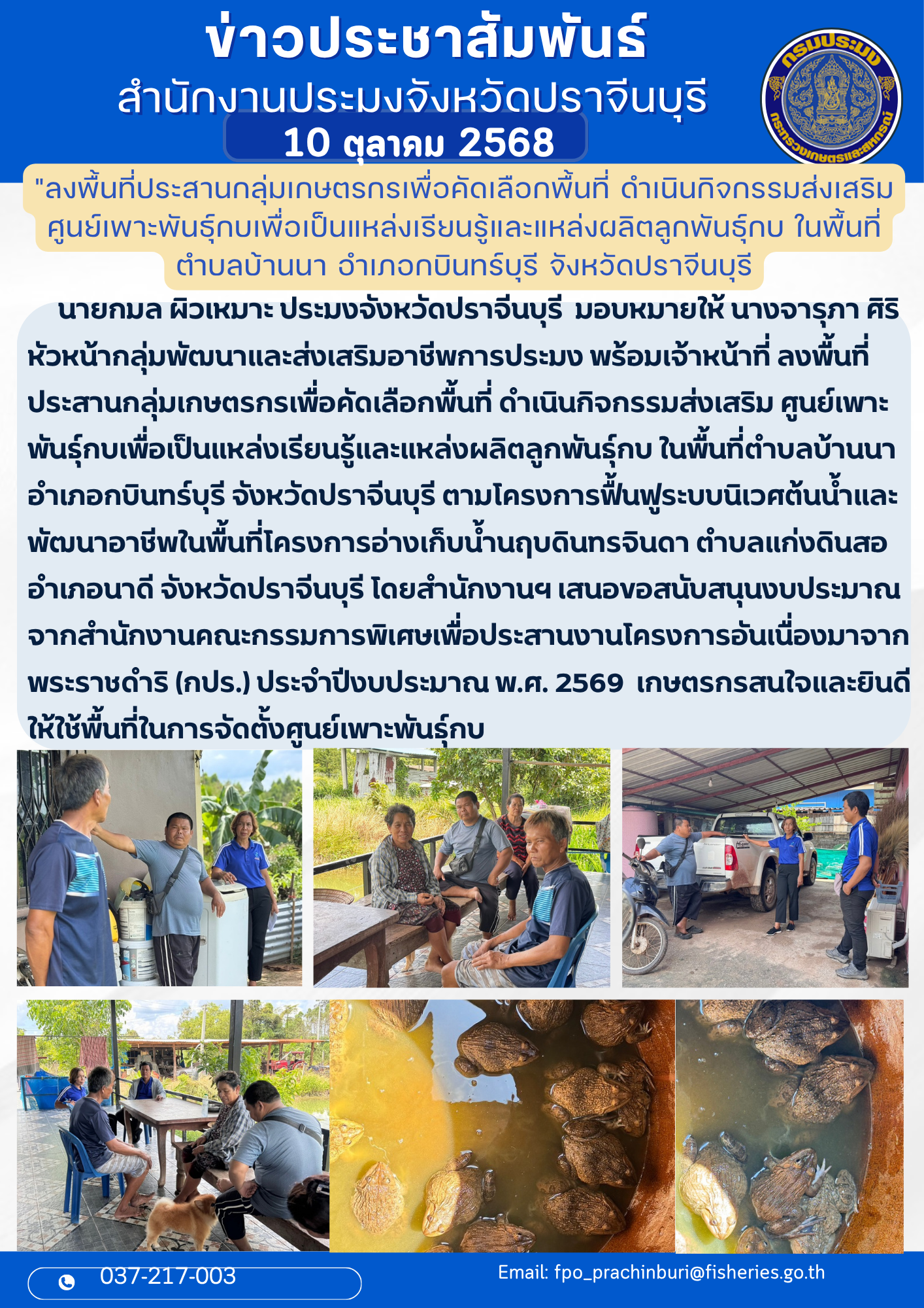 ข่าวประชาสัมพันธ์ ลงพื้นที่ ประสานกลุ่มเกษตรกรเพื่อคัดเลือกพื้นที่ ดำเนินกิจกรรมส่งเสริม ศูนย์เพาะ พันธุ์กบเพื่อเป็นแหล่งเรียนรู้และแหล่งผลิตลูกพันธุ์กบ ในพื้นที่ตำบลบ้านนา อำเภอกบินทร์บุรี จังหวัดปราจีนบุรี ตามโครงการฟื้นฟูระบบนิเวศต้นน้ำและ พัฒนาอาชีพในพื้นที่โครงการอ่างเก็บน้ำนฤบดินทรจินดา